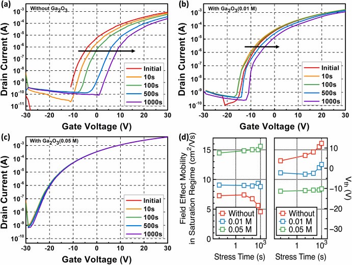 与传统金属氧化物 TFT 钝化方法不同,Ga2O3 钝化层不仅提升稳定性,还增强了场效应迁移率。由于 Ga2O3 的工作函数低于 SnO2,电子被限制在 SnO2 势阱内形成准二维电子气,从而提升自由载流子浓度。这使场效应迁移率提升1.5倍(从约 10 cm2/Vs 增至约 15 cm2/Vs),同时保持强偏压稳定性。总体而言,该 SnO2–Ga2O3 钝化方案为下一代电子器件(包括薄膜晶体管、太阳能电池、透明电极及电阻式随机存取存储器)提供了实现偏压稳定、高性能金属氧化物薄膜的可行路径。