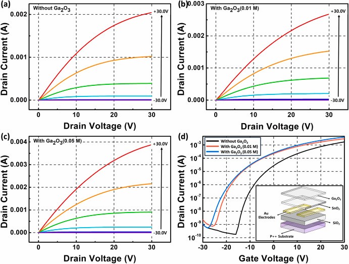 图4. 具有不同 Ga2O3 钝化层的 SnO2 薄膜晶体管代表性 ID-VD 特性曲线:(a)无 Ga2O3 钝化层,(b)含 0.01M Ga2O3 钝化层,(c)含 0.05M Ga2O3 钝化层。图 (d) 为制备的薄膜晶体管在有无 Ga2O3 钝化层条件下的代表性转移曲线。插图展示了具有 Ga2O3 钝化层的 SnO2 薄膜晶体管示意图。