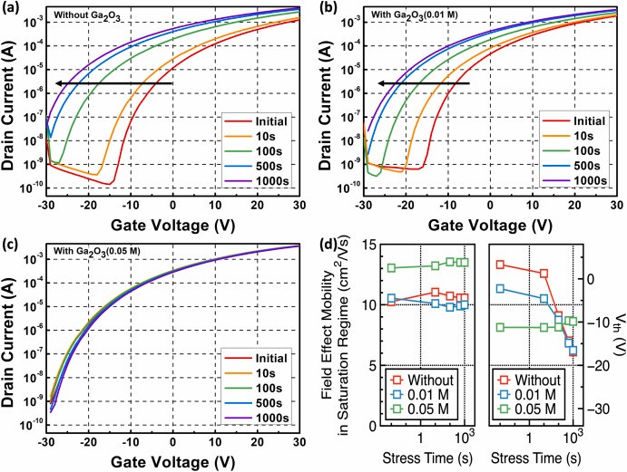 图5. SnO2 薄膜晶体管在NBS测试中的代表性传输特性:(a)无 Ga2O3 钝化层;(b)含 0.01M Ga2O3 钝化层;(c)含 0.05M Ga2O3 钝化层。(d)NBS 测试中提取的饱和场效应迁移率与阈值电压 Vth。