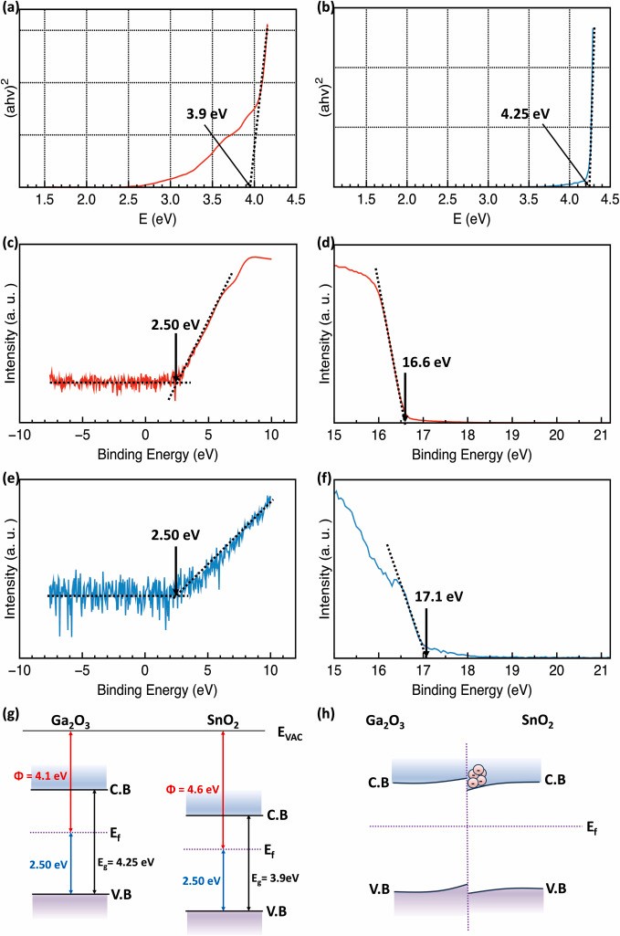 图7. (a) SnO2 与 (b) Ga2O3(0.05 M) 薄膜的 Tauc 图((ahv)2 与光子能量关系)。(c, d) SnO2 薄膜 UPS 光谱的低/高结合能斜率。(e, f) Ga2O3(0.05 M)薄膜的 UPS 光谱中低/高结合能斜率。(g, h) Ga2O3(0.05 M)与 SnO2 接触前后的能级对齐示意图。
