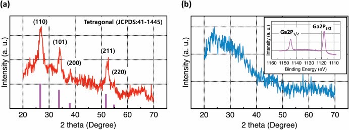 图1. (a)单层 SnO2 薄膜与(b)单层 Ga2O3 薄膜的 GIXRD 光谱。插图显示 Ga 2p 的高分辨率 XPS 光谱。