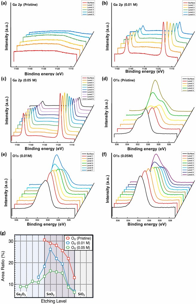 图3. 未含 Ga2O3 的 SnO2 薄膜、含 Ga2O3 钝化层的薄膜以及含 Ga2O3(0.05 M)钝化层的薄膜的高分辨率 XPS 深度剖面光谱。图 (a) 至 (c) 展示 Ga 2p 光谱,(d) 至 (f) 展示 O 1s 光谱,(g)汇总了 O 1s 深度剖面结果。
