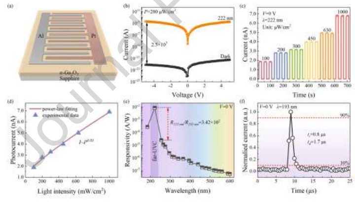 图3. (a) Pt/α-Ga2O3/Al 光探测器结构示意图。(b) 器件在暗态及 222 nm 光照射下的 I-V 特性曲线。(c) 零偏压下不同强度 222 nm 光照射的 I-t 曲线。(d) 光电流随光强变化曲线及对应的幂律拟合线。(e) 自供电光探测器在不同波长下的响应度。(f) 单周期瞬态响应曲线。