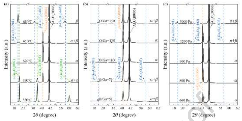 图1. 在 c 面蓝宝石衬底上生长 Ga2O3 的 XRD 图谱,分别对应不同 (a) 生长温度、(b) O/Ga 摩尔比和 (c) 反应室压力条件。