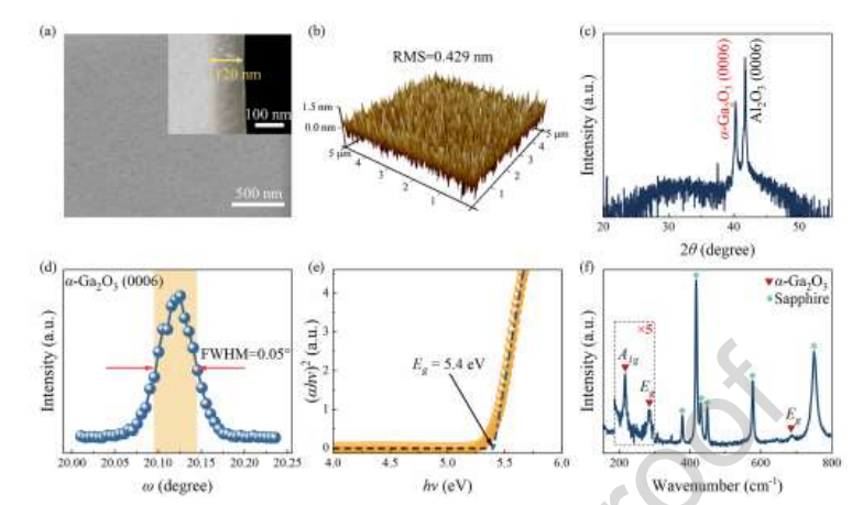 图2. (a) 表面及截面扫描电子显微镜图像,(b) 原子力显微镜图像,(c) X 射线衍射 θ-2θ 扫描图(对数强度标度),(d) (0006) 摇摆曲线,(e) (αhυ)2 与 hυ 关系图,以及 (f) 沉积于 c-Al2O3 衬底上的 α-Ga2O3 薄膜拉曼光谱。
