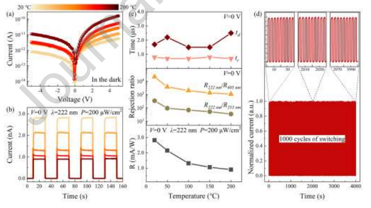 图4. (a) 暗态下的 I-V 特性曲线;(b) 不同温度下 0 V 偏压条件下的时变电流响应;(c) 响应度、抑制比与响应时间随温度变化的关系;(d) 器件经 1000 次循环后的 I-t 曲线。