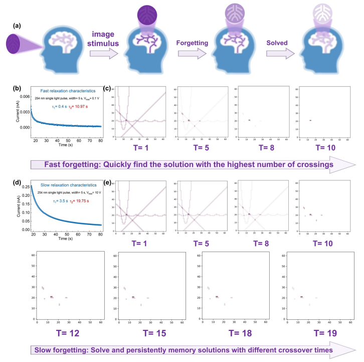 图5. 基于不同器件遗忘特性的脑启发遗忘算法求解方程组。(a)人视觉系统对图像的感知与遗忘过程,包括光信号刺激、图像感知与初始化、遗忘过程(逐步形成对比度)及目标图像生成。(b)器件在 254 nm 单光脉冲刺激与 0.1 V 偏压下的遗忘曲线。(c)基于器件快速遗忘特性,结合单光脉冲刺激与偏压条件下的遗忘过程所构建的解方程组模型。(b) 设备在 254 nm 单光脉冲刺激与 0.1 V 偏压下的遗忘曲线。(c) 基于设备快速遗忘特性,结合遗忘算法求解方程组动态过程。(d) 设备在 254 nm 单光脉冲刺激及 10 V 偏压下的遗忘曲线。(e) 基于设备缓慢遗忘特性,结合遗忘算法求解方程组动态过程。