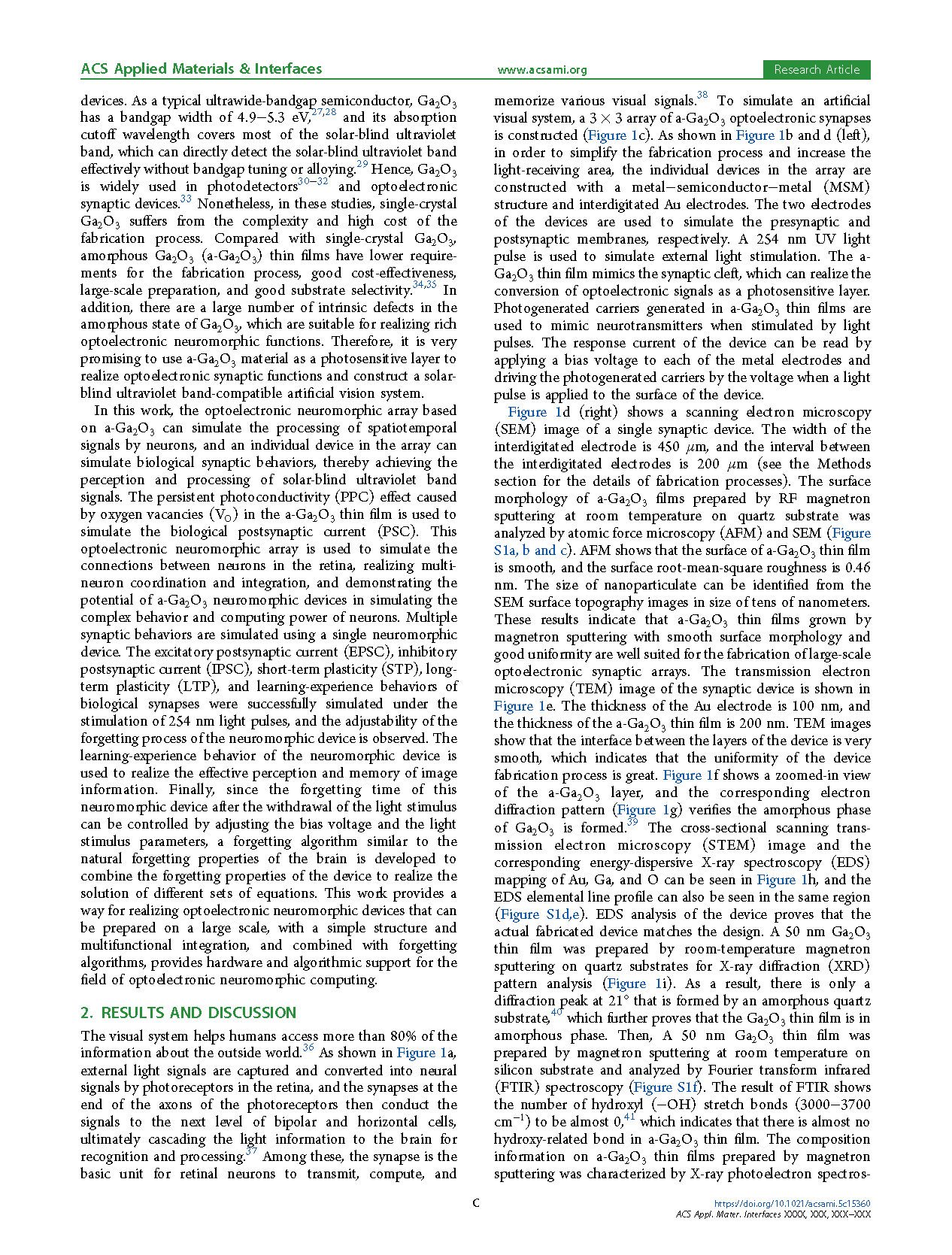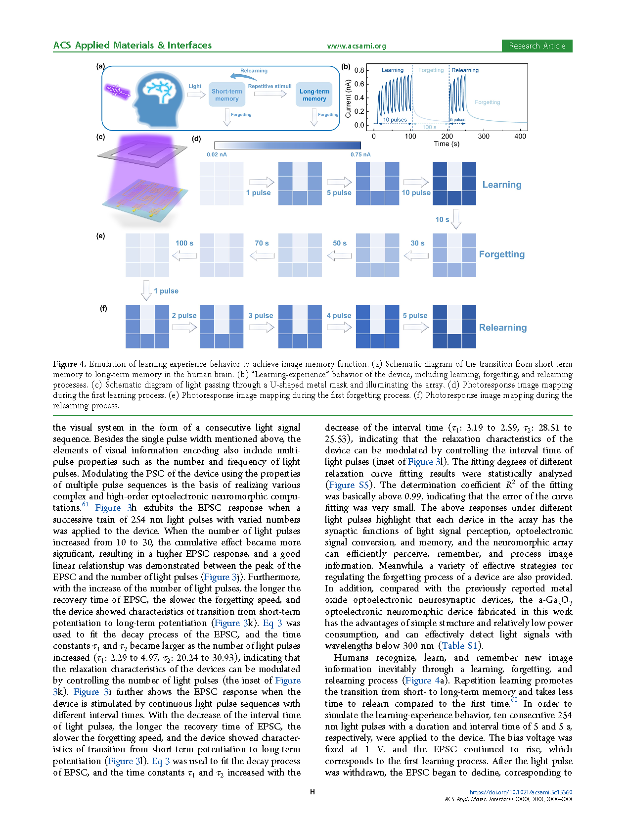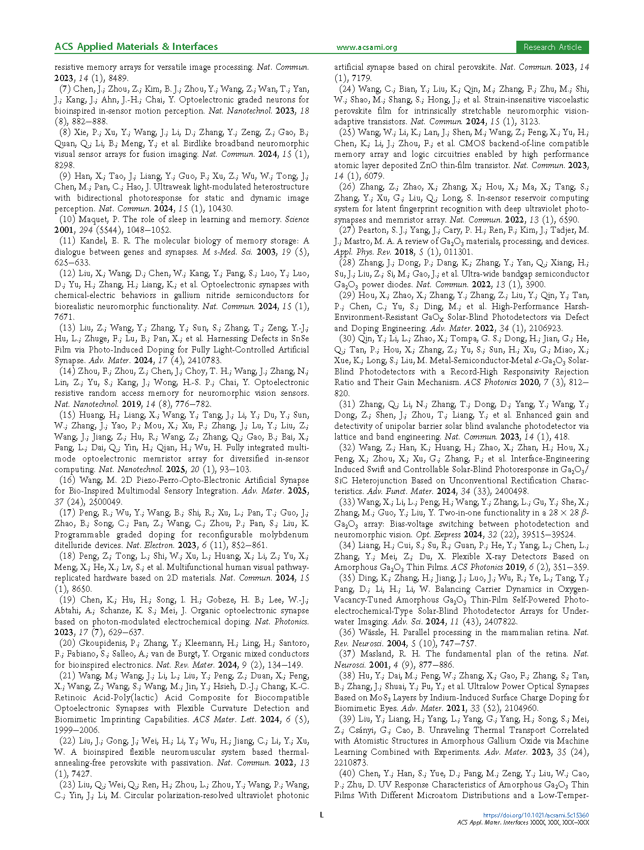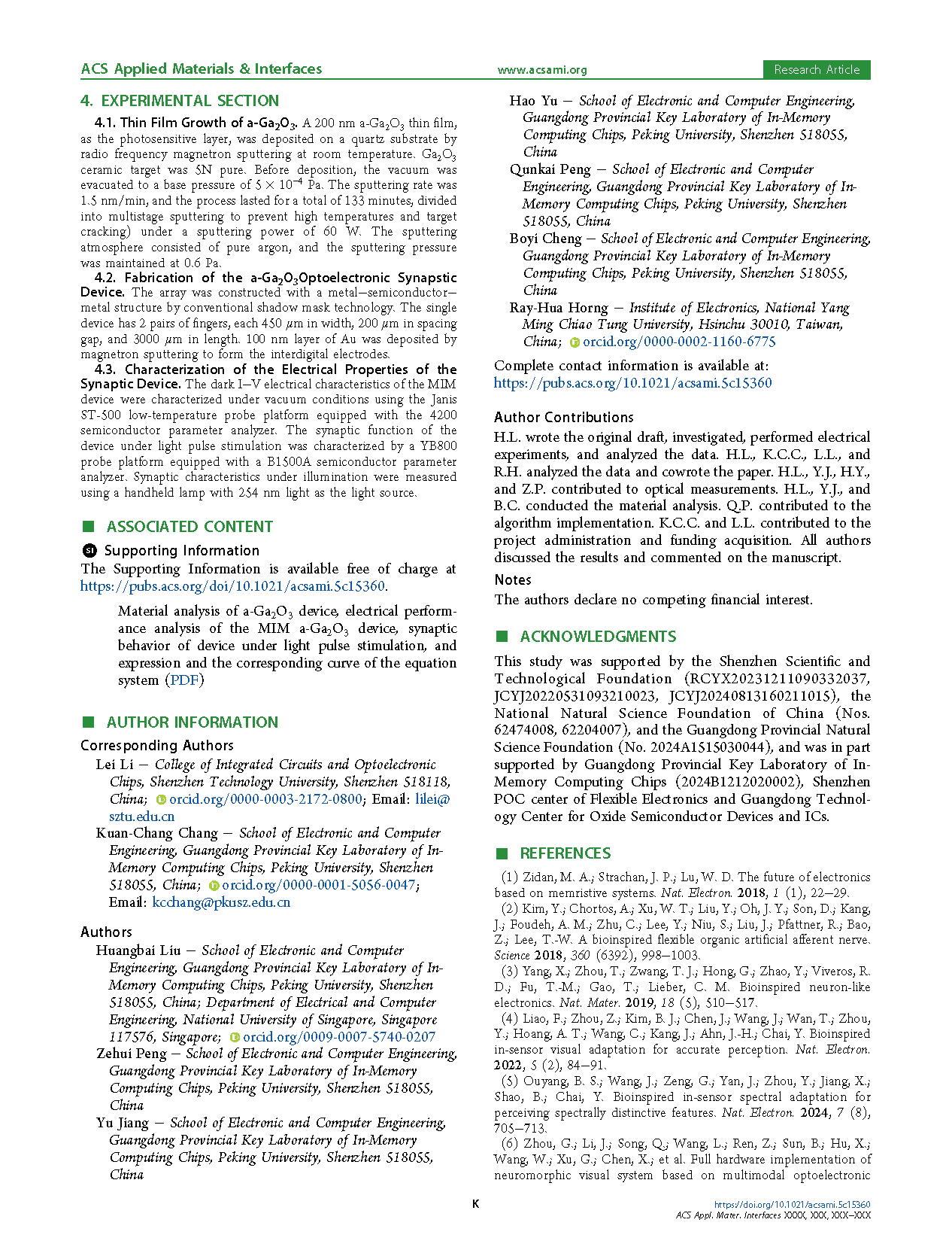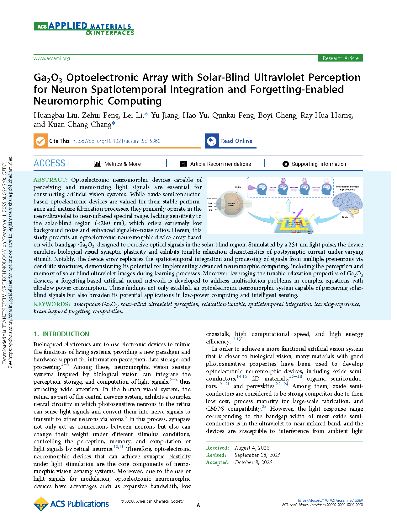 由北京大学联合国立阳明交通大学洪瑞華教授的研究团队在学术期刊 ACS Applied Materials & Interfaces 发布了一篇名为 Ga2O3 Optoelectronic Array with Solar-Blind Ultraviolet Perception for Neuron Spatiotemporal Integration and Forgetting-Enabled Neuromorphic Computing(用于神经元时空整合与遗忘式神经形态计算的、具有日盲紫外感知能力的 Ga2O3 光电阵列)的文章。