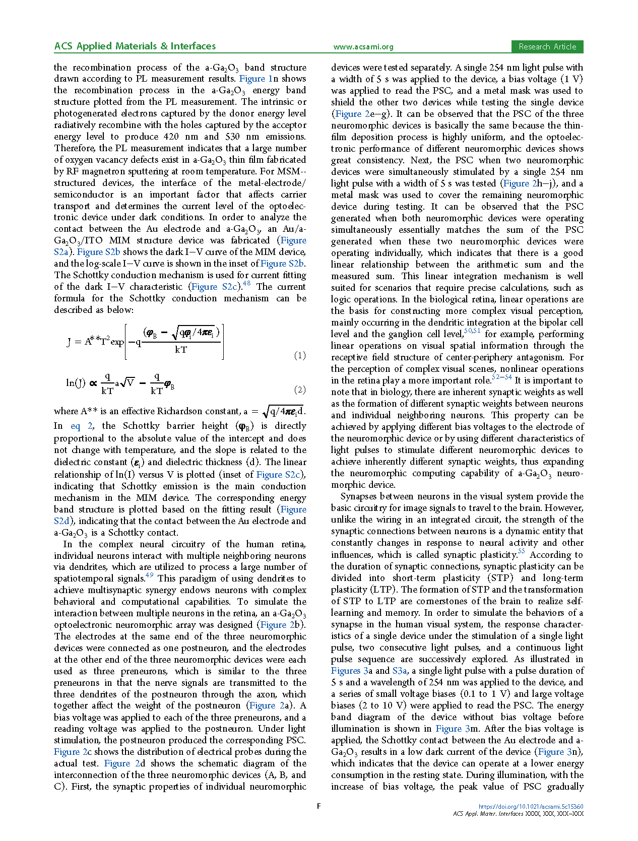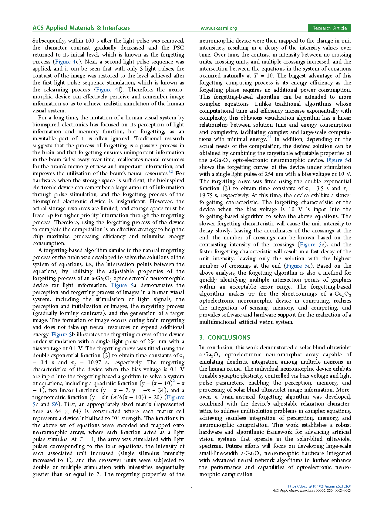 综上所述,本研究成功演示了一种具备日盲紫外光特性的 a-Ga2O3 光电神经形态阵列,能够模拟人类视网膜中多个神经元间的树突整合。该神经形态器件通过偏置电压与光脉冲参数调控,展现出可调的突触可塑性,从而实现对日盲紫外图像信息的感知、记忆与处理。此外,通过结合设备可调的弛豫特性,开发出仿生遗忘算法以解决复杂方程中的多解问题,实现了感知、记忆与神经形态计算的无缝集成。本研究为推进工作于日盲紫外光谱的人工视觉系统,建立了稳健的硬件与算法框架。未来研究将聚焦于开发大规模窄线宽 a-Ga2O3 神经形态硬件,并集成先进神经网络算法,以进一步提升光电神经形态计算的性能与能力。