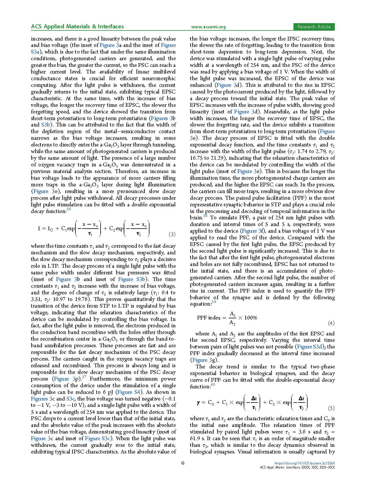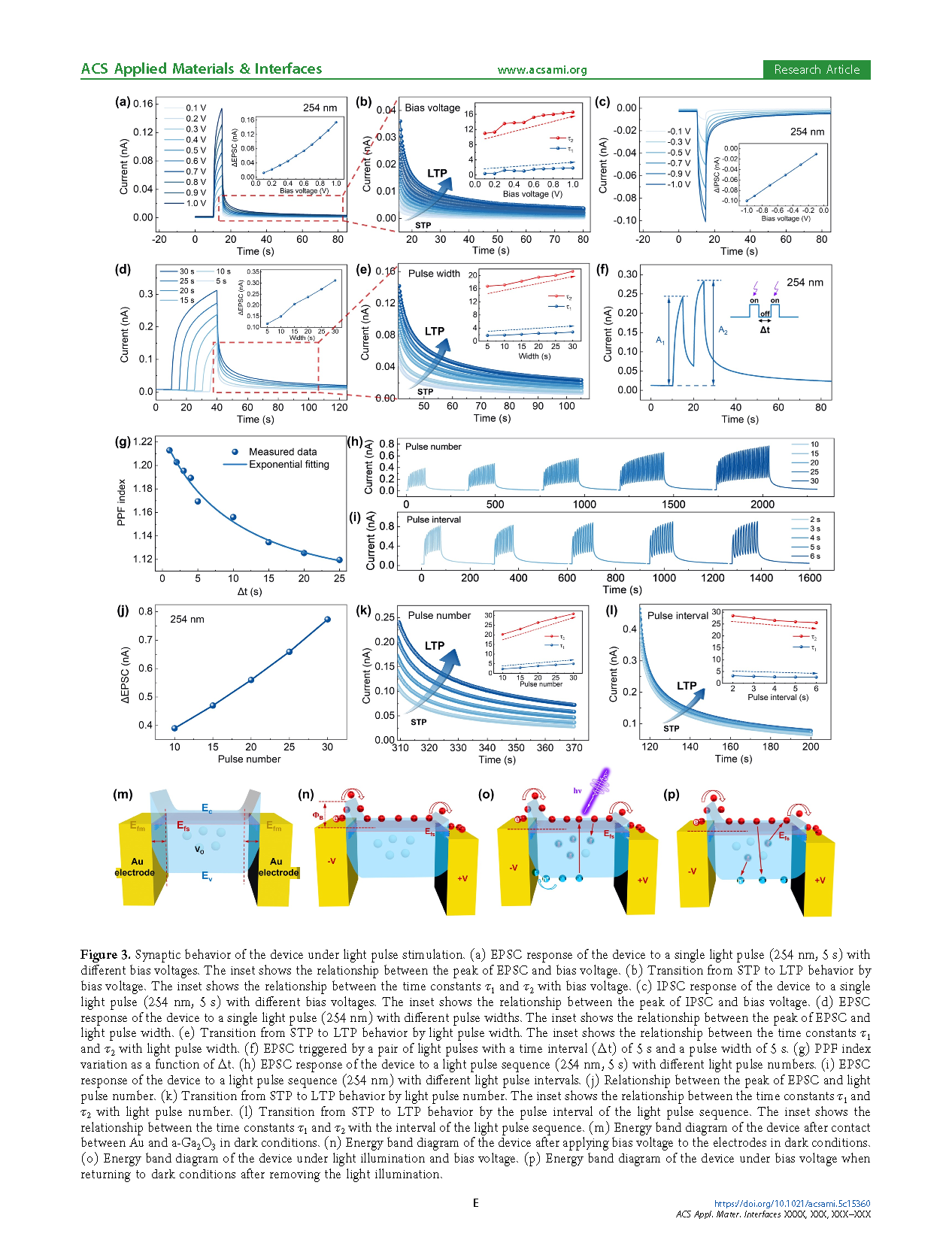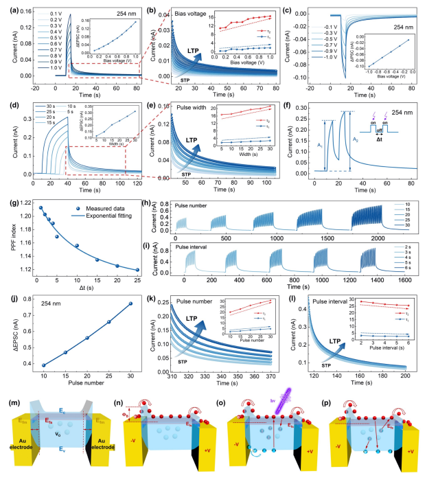 图3. 光脉冲刺激下器件的突触行为。(a) 不同偏压下器件对单次光脉冲(254 nm,5 s)的 EPSC 响应。插图显示 EPSC 峰值与偏压的关系。(b) 偏压诱导的 STP 向 LTP 行为转变。插图显示时间常数 τ1 和 τ2 与偏压的关系。(c) 不同偏压下器件对单次光脉冲(254 nm,5 s)的 IPSC 响应。插图显示 IPSC 峰值与偏压的关系。(c) 不同偏压下单次光脉冲(254 nm,5 s)引发的 IPSC 响应。插图显示 IPSC 峰值与偏压的关系。(d) 不同脉冲宽度下单次光脉冲(254 nm)引发的 EPSC 响应。插图显示 EPSC 峰值与光脉冲宽度的关系。(e) 光脉冲宽度诱导的 STP 向 LTP 行为转变。插图展示时间常数 τ1 与 τ2 随光脉冲宽度变化的关系。(f) 由一对光脉冲(时间间隔 Δt=5 s,脉冲宽度 5 s)触发的 EPSC 响应。(g) PPF 指数随 Δt 变化的曲线。(h) 器件对不同光脉冲数量(254 nm,5 s)序列的 EPSC 响应。(i) 器件对不同光脉冲间隔(254 nm)序列的 EPSC 响应。(j) EPSC 峰值与光脉冲数量的关系。 (k) 基于光脉冲数量实现从短时程增强 (STP) 到长时程增强(LTP)的行为转变。插图展示时间常数 τ1 与 τ2 随光脉冲数量的变化关系。 (l) 基于光脉冲序列间隔实现 STP 到 LTP 行为转变。插图展示时间常数 τ1 与 τ2 随光脉冲序列间隔的变化关系。(m) 暗态下金与 α-Ga2O3 接触后的器件能带图。(n) 暗态下电极施加偏压后的器件能带图。(o) 光照与偏压并存状态下的器件能带图。(p) 移除光照后返回暗态时施加偏压的器件能带图。