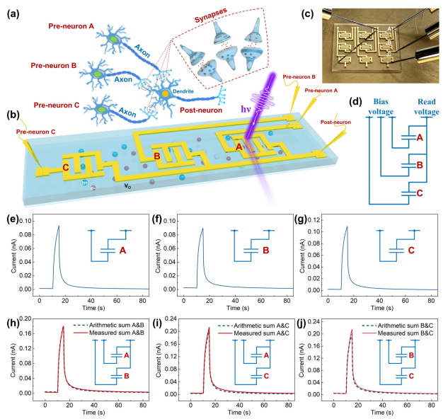 图2. 多神经元间连接的仿真示意图。 (a) 神经元通过树突连接至多个神经元的示意图。(b) 阵列中器件间的连接关系。(c) 测试中的类脑阵列实物照片。(d) 阵列中三神经元互连的符号示意图。 (e) 神经元 A、 (f) 神经元 B、(g) 神经元 C 对单个光脉冲(254 nm,5 s)的压电电容响应输出。当 (h) 神经元 A 与神经元 B、(i) 神经元 A 与神经元 C、(j) 神经元 B 与神经元 C 同时受到单个光脉冲(254 nm,5 s)刺激时,输出算术和与测量输出和的对应关系。