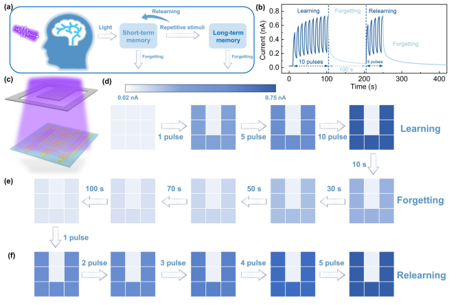 图4. 通过模拟学习-遗忘行为实现图像记忆功能。(a) 人脑短期记忆向长期记忆转化的示意图。(b) 装置的“学习-遗忘”行为,包含学习、遗忘及再学习过程。(c) 光线穿过U形金属掩模照射阵列的示意图。(d) 首次学习过程中的光响应图像映射。(e) 首次遗忘过程中的光响应图像映射。(f) 重新学习过程中的光响应图像映射。