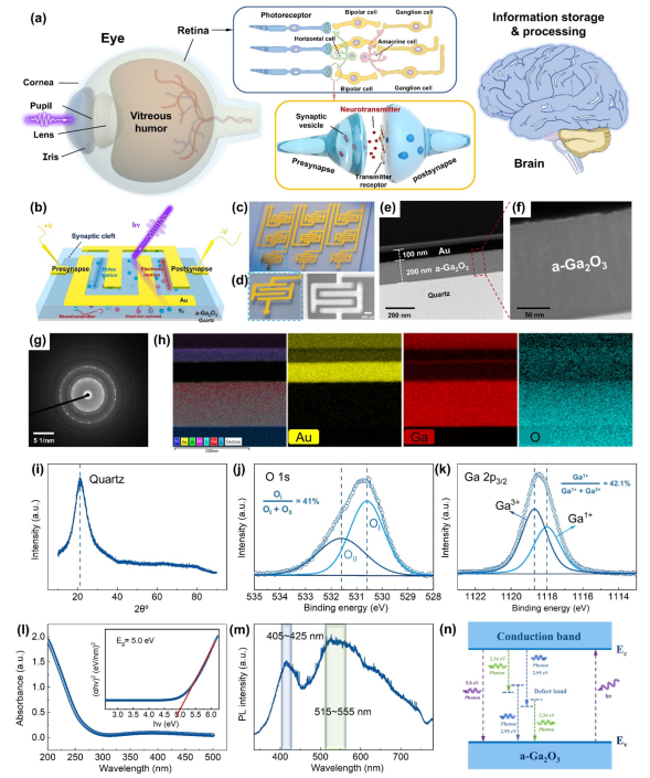 图1. 非晶态 Ga2O3 光电神经形态器件的设计与结构。(a) 人类视觉系统及视网膜神经元示意图。(b) 非晶态 Ga2O3 光电神经形态器件示意图。(c) 3 × 3 非晶 Ga2O3 光电神经形态阵列的光学显微镜图像。(d) 阵列中单个 a-Ga2O3 器件的光学显微镜(左)与扫描电子显微镜(右)图像。(e) 器件的透射电子显微镜图像。(f) a-Ga2O3 区域的放大视图。(g) 由 (f) 图提取的衍射图样。(h) 器件的能谱分布图。(i) a-Ga2O3 薄膜的 X 射线衍射图样。(j) a-Ga2O3 薄膜的 O 1s 谱。(k) a-Ga2O3 薄膜的 Ga 2p3/2 谱。(l) 原始 Ga2O3 薄膜的吸光度光谱及插图中样品的 (αhν)2 与 hν 关系曲线。(m) 原始 Ga2O3 薄膜的荧光光谱。(n) 原始 Ga2O3 薄膜在绿色与蓝色区域的荧光机制模型。