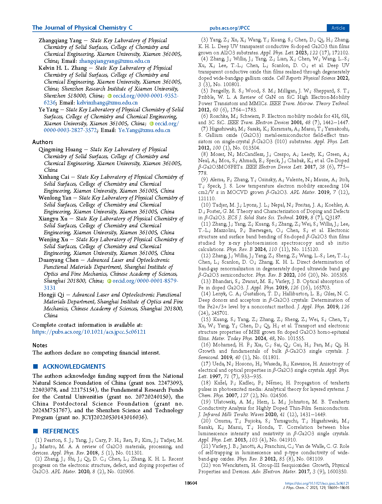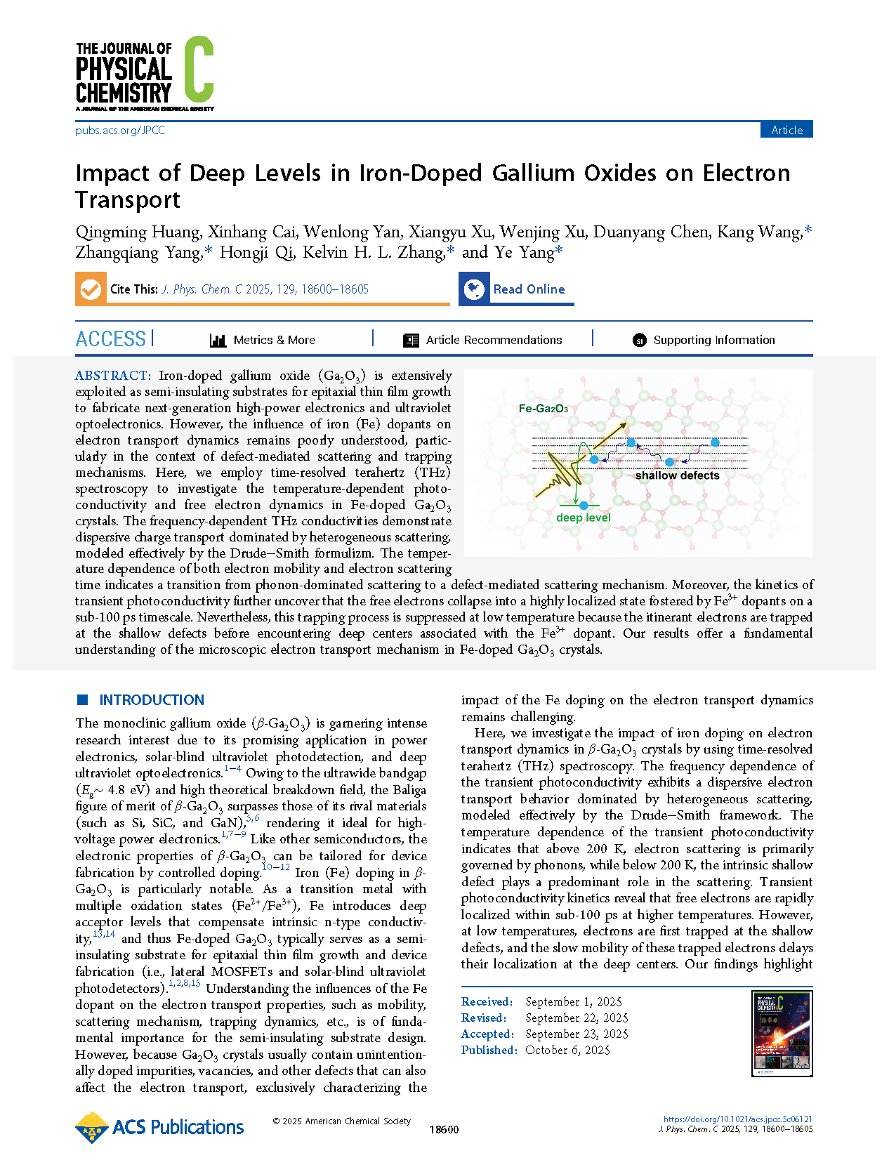 由厦门大学杨晔教授、张洪良教授联合上海光学精密机械研究所齐红基研究员领导的研究团队在学术期刊 Journal of Physical Chemistry C 发布了一篇名为 Impact of Deep Levels in Iron-Doped Gallium Oxides on Electron Transport(铁掺杂氧化镓中深能级的电子输运影响)的文章。