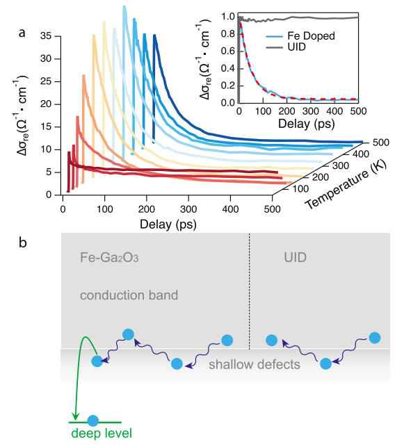 图3. Fe 掺杂 β-Ga2O3 中自由载流子动力学的温度依赖性。(a) 1 THz 探测下 Δσre 动力学的温度依赖性。插图:300 K 下铁掺杂与非掺杂 (UID)β-Ga2O3 晶体的归一化 Δσre 动力学对比。红色虚线为拟合曲线。(b) 铁掺杂与 UID β-Ga2O3 晶体中光载流子输运动力学的示意图。