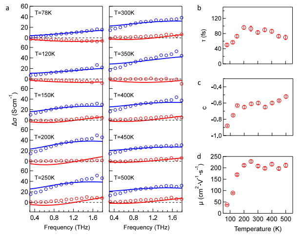 图2. 铁掺杂 β-Ga2O3 的太赫兹光导率温度依赖性。(a) 在泵探测延迟为 5 ps 时测得的温度依赖性复光导率。蓝色和红色圆点分别对应实部和虚部。实线表示 Drude-Smith 拟合模型。基于 Drude-Smith 模型对太赫兹电导率拟合所得:(b) 背散射系数、(c) 电子散射时间常数及 (d) 直流电子迁移率的温度依赖性。误差条表示拟合不确定度。