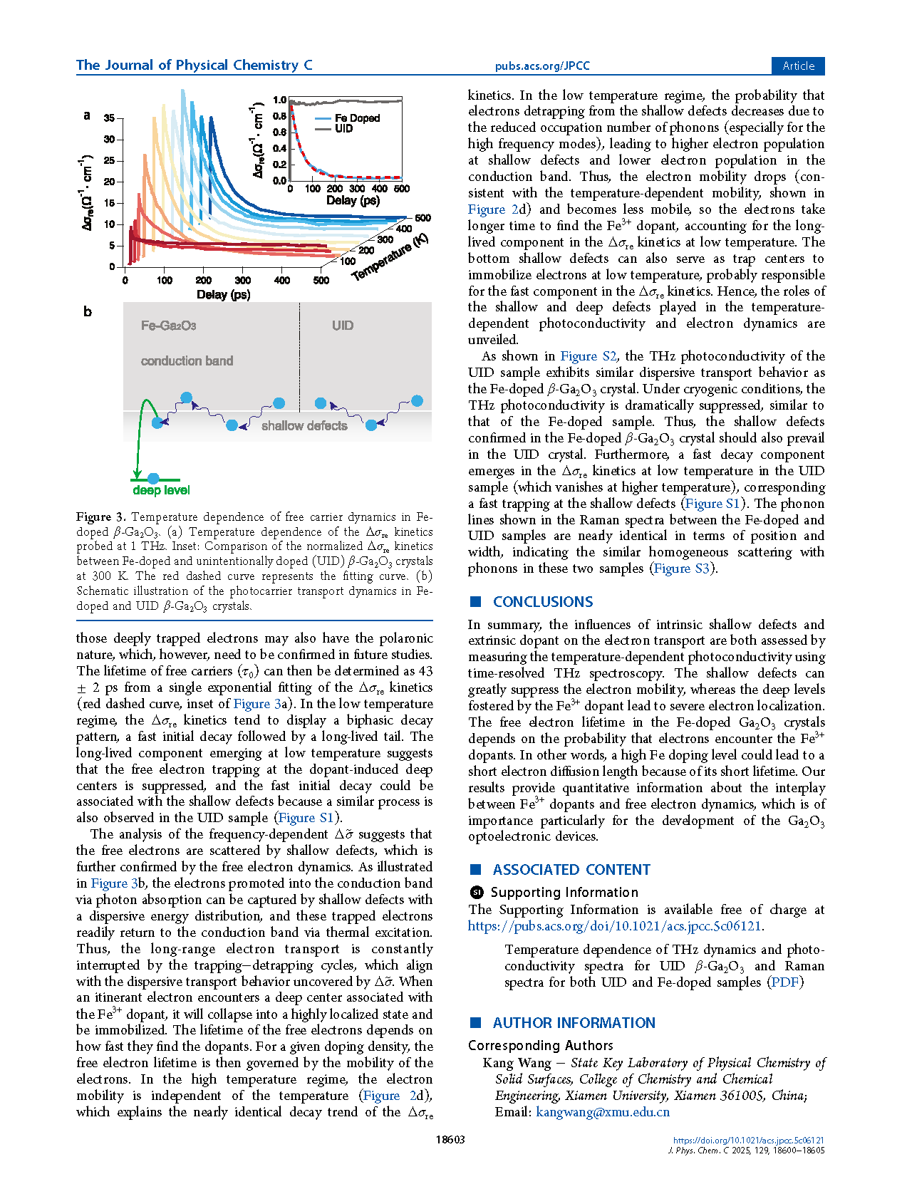 ● 明确区分并阐明了浅层缺陷和 Fe3+ 深层中心在电子传输中扮演的不同角色——前者限制迁移率,后者导致局域化。并揭示了这两种缺陷在不同温度下对电子动力学的相互作用的动态过程。
