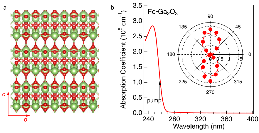 图1. Fe 掺杂 β-Ga2O3 的各向异性吸收特性。(a) 由 b 轴和 c 轴确定的晶格平面示意图。绿色与红色球体分别代表镓原子和氧原子。(b) 椭圆偏振仪测得的 c 轴方向吸收系数。插图展示泵浦波长下的各向异性吸收特性。对应吸收最小值的偏振角被任意设定为 0° 或 180°。