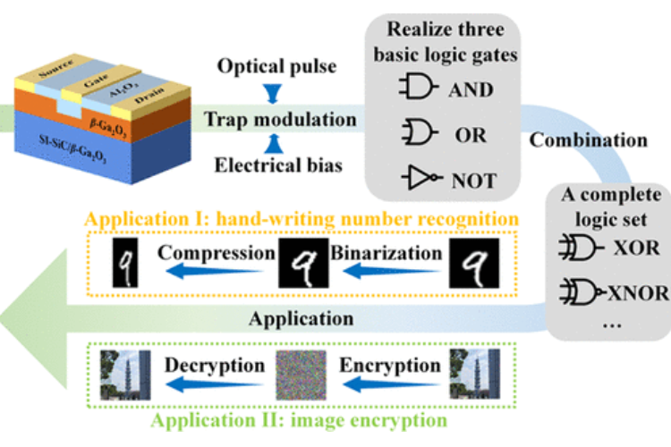 可重构布尔逻辑门因其在低能耗、短时延和高集成电路密度等方面的潜在优势,近年来受到广泛关注。突触型器件作为可通过端电压调节实现逻辑门重构的候选器件,尤其在结合光刺激信号时,展现出独特的应用潜力。本研究提出了一种基于 β-Ga2O3 金属–氧化物–半导体场效应晶体管(MOSFET)的光电突触器件,并利用俘获载流子调控机制实现了可重构布尔逻辑功能。研究系统探讨了器件的突触特性,包括兴奋性突触后电流(EPSC)、双脉冲促进效应(PPF)以及短期记忆(STM)到长期记忆(LTM)的转变过程。实验结果表明,该 β-Ga2O3 光电突触器件在单次 EPSC 响应中表现出极低能耗(Econ)和优异的抗噪声性能。此外,通过调节端电压,可成功实现AND、OR 及 NOT 逻辑门操作。结合其可重构逻辑功能与突触行为,本文进一步展示了该器件在手写数字识别与图像加密两类典型应用中的可行性。基于俘获态调控机制的 β-Ga2O3 光电突触器件的成功验证,为高性能数字系统中的可重构布尔逻辑门提供了坚实的技术路径。