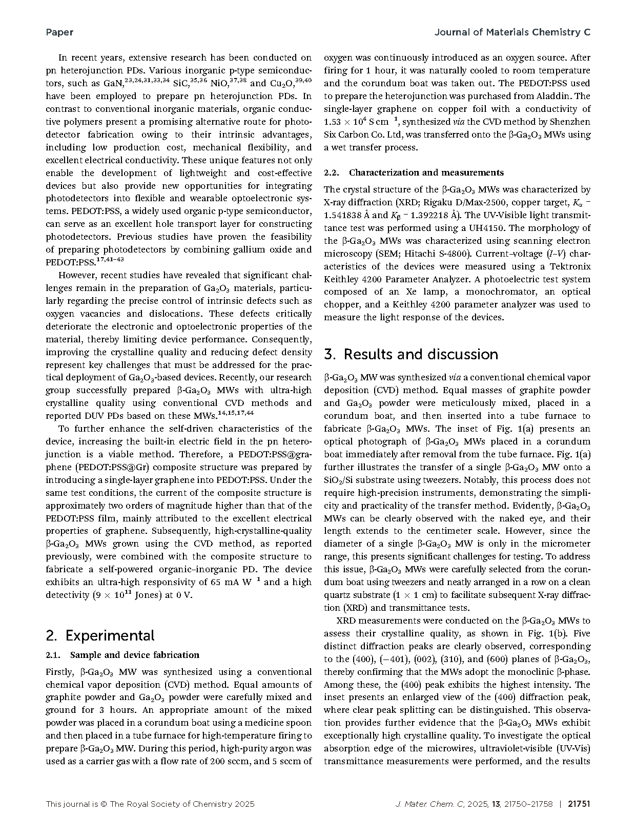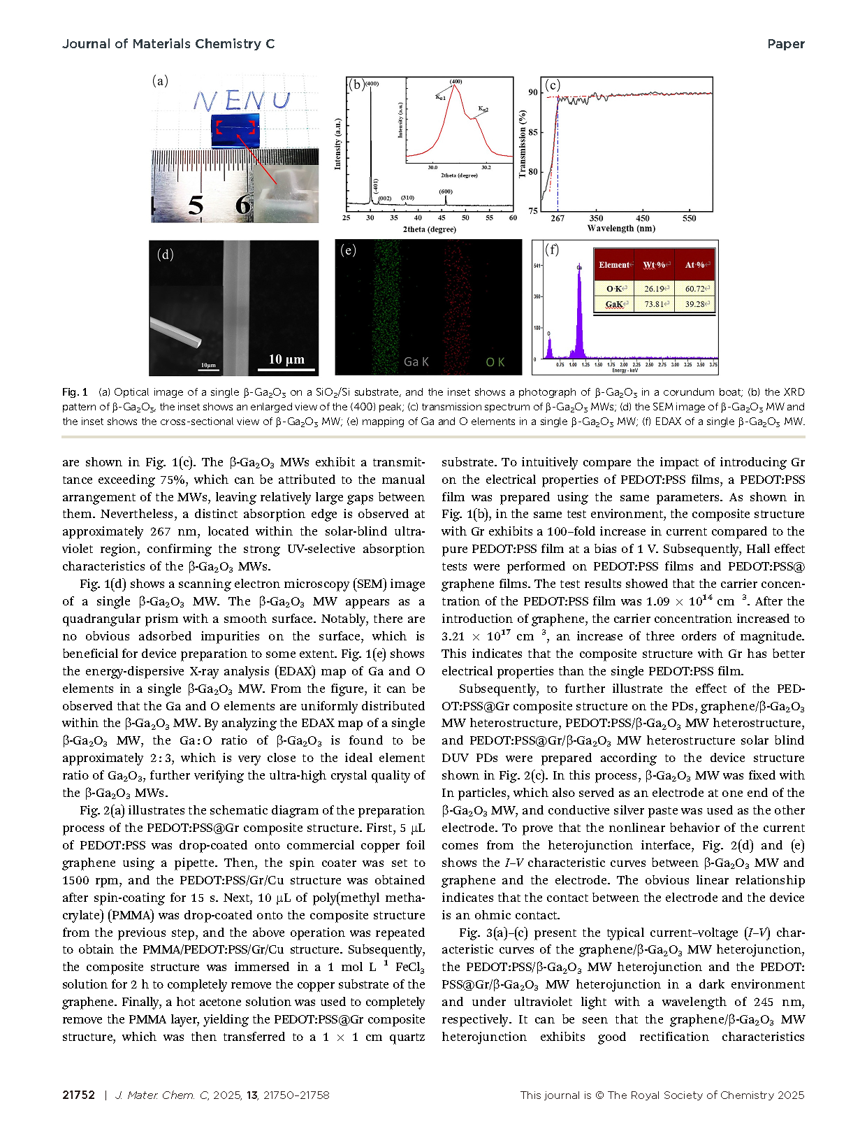 【会员论文】东北师范大学李炳生教授团队:高响应度石墨烯增强型PEDOT:PSS β氧化镓微米线有机无机杂化异质结自供电光电探测器