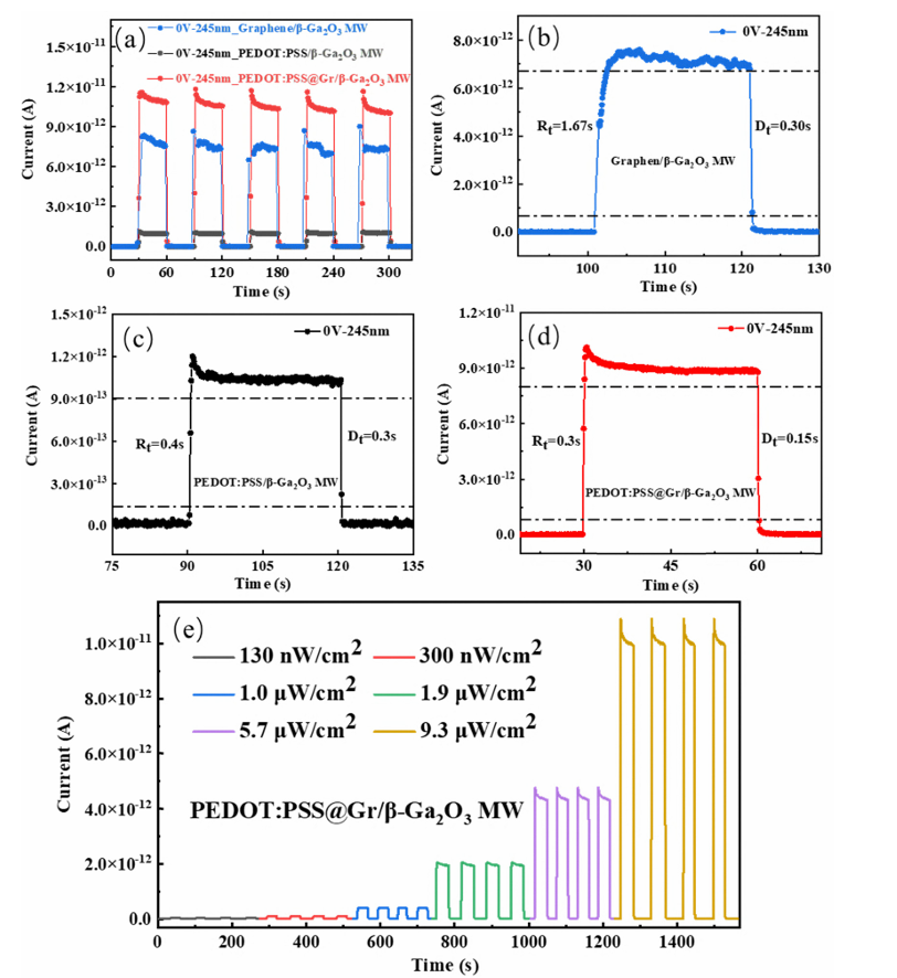 图4 (a) 三种异质结光电探测器在 245 nm 光照和 0 V 条件下的 I–t 曲线; (b) 石墨烯/β-Ga₂O₃ 微米线异质结的时间响应, (c) PEDOT:PSS/β-Ga₂O₃ 微米线异质结的时间响应, (d) PEDOT:PSS@Gr/β-Ga₂O₃ 微米线异质结的时间响应; (e) PEDOT:PSS@Gr/β-Ga₂O₃ 微米线异质结在不同光强下的 I–t 循环曲线。