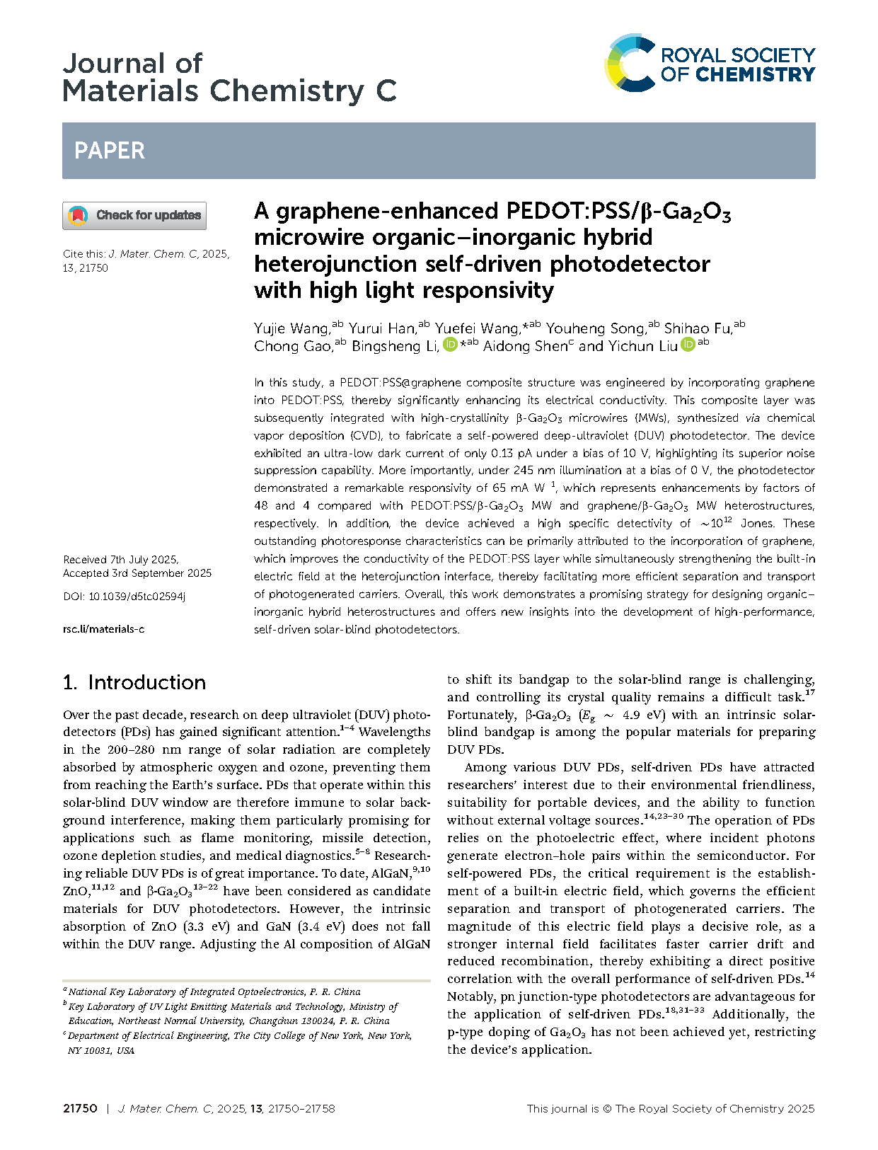 由东北师范大学李炳生教授领导的研究团队在学术期刊 Journal of Materials Chemistry C 发布了一篇名为 A graphene-enhanced PEDOT:PSS/β-Ga2O3 microwire organic–inorganic hybrid heterojunction self-driven photodetector with high light responsivity(一种具有高光响应度的石墨烯增强型 PEDOT:PSS/β-Ga2O3 微米线有机-无机杂化异质结自供电光电探测器)的文章。