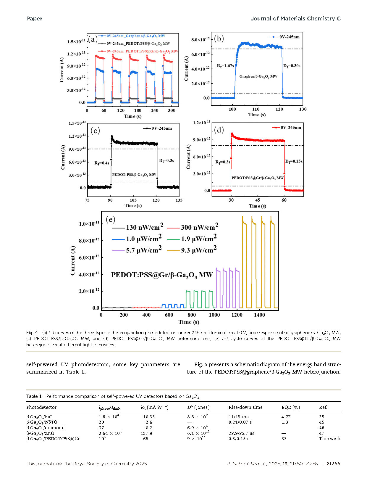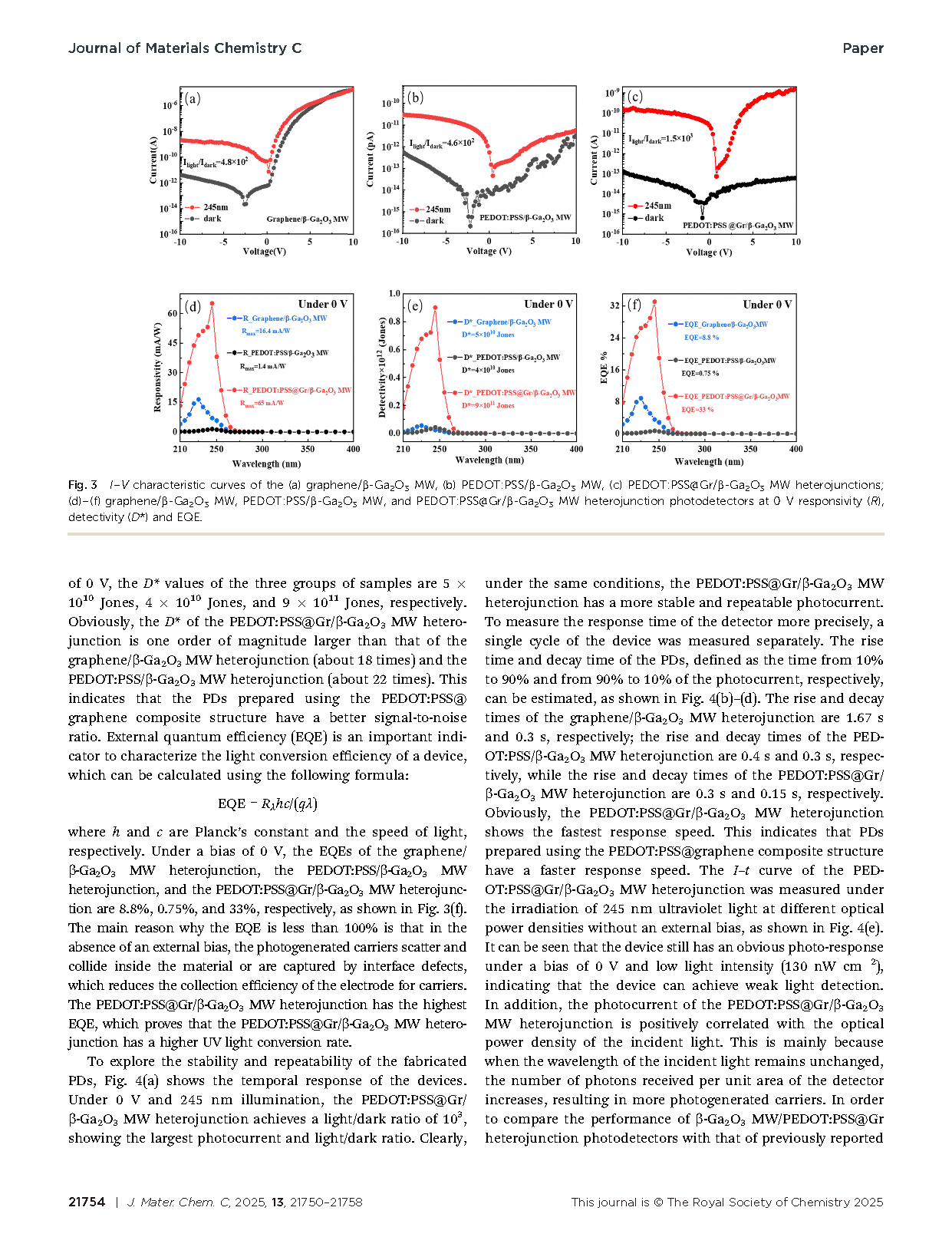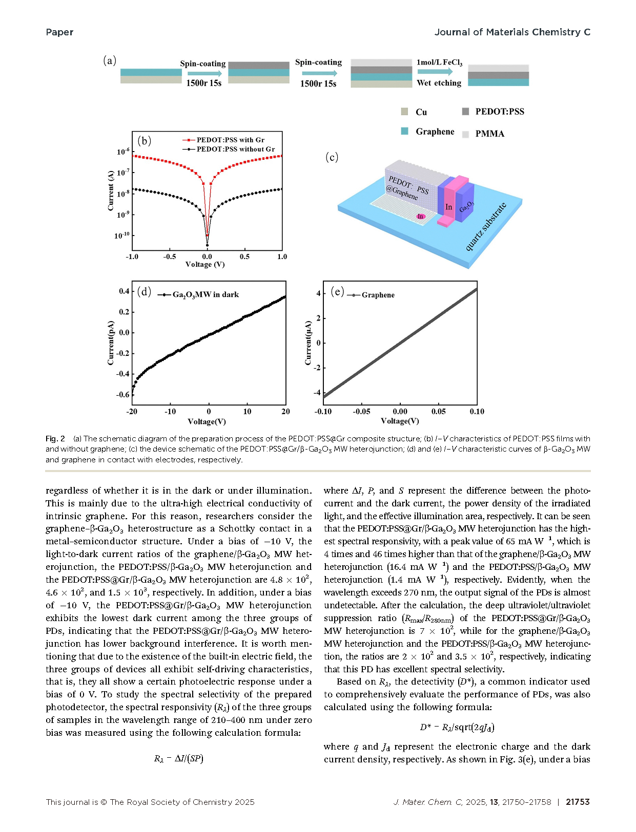 本研究通过将石墨烯引入PEDOT:PSS,构建了PEDOT:PSS@石墨烯复合结构,从而显著增强了其电导率。随后,该复合层与通过化学气相沉积(CVD)合成的高结晶度 β-Ga2O3 微米线(MWs)结合,制备出自供电深紫外(DUV)光电探测器。器件在10 V偏置下表现出超低暗电流,仅为 0.13 pA,显示出优异的噪声抑制能力。更重要的是,在 245 nm 照射且 0 V 偏置条件下,该光电探测器展现出高达 65 mA W-1 的光响应度,相比 PEDOT:PSS/β-Ga2O3 MW 和石墨烯/β-Ga2O3 MW 异质结构分别提升了 48 倍和 4 倍。此外,器件还实现了约 1012 Jones 的高比探测率。这些优异的光响应性能主要归因于石墨烯的引入,既提高了 PEDOT:PSS 层的电导率,又增强了异质结界面的内建电场,从而促进光生载流子的高效分离与传输。总体而言,本工作为设计有机–无机杂化异质结构提供了有前景的策略,并为高性能自供电日盲光电探测器的开发提供了新的思路。