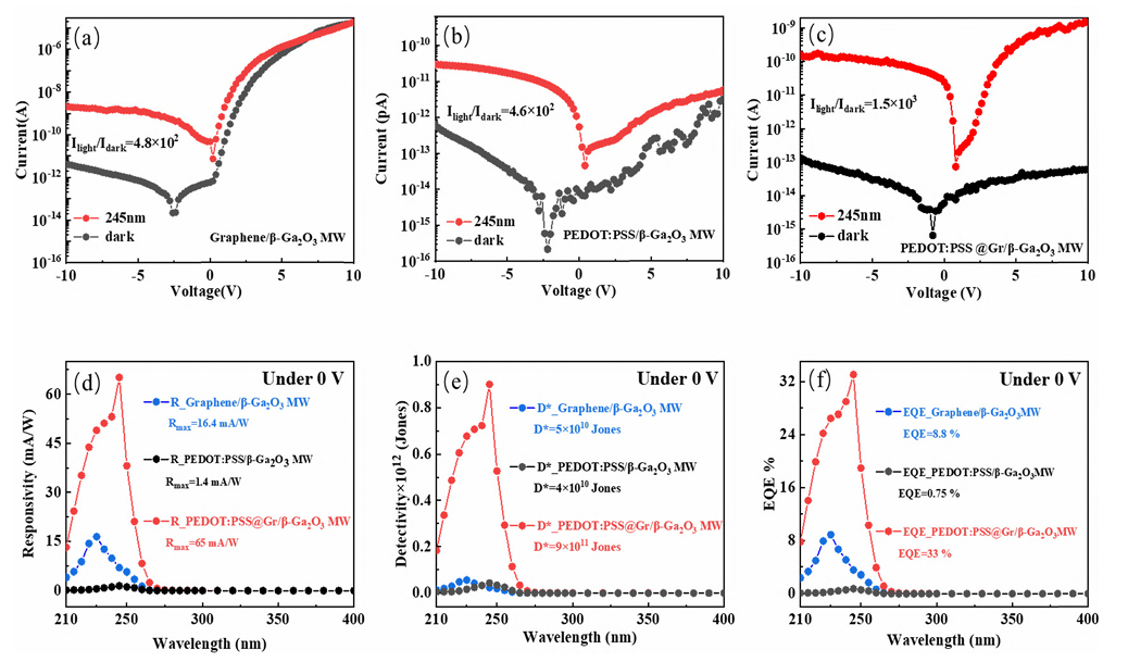 图3 (a) 石墨烯/β-Ga₂O₃ 微米线,(b) PEDOT:PSS/β-Ga₂O₃ 微米线,(c) PEDOT:PSS@Gr/β-Ga₂O₃ 微米线异质结的 I–V 特性曲线;(d)–(f) 分别为石墨烯/β-Ga₂O₃ 微米线、PEDOT:PSS/β-Ga₂O₃ 微米线以及 PEDOT:PSS@Gr/β-Ga₂O₃ 微米线异质结光电探测器在 0 V 下的响应度 (R)、探测率 (D*) 与外量子效率 (EQE)。