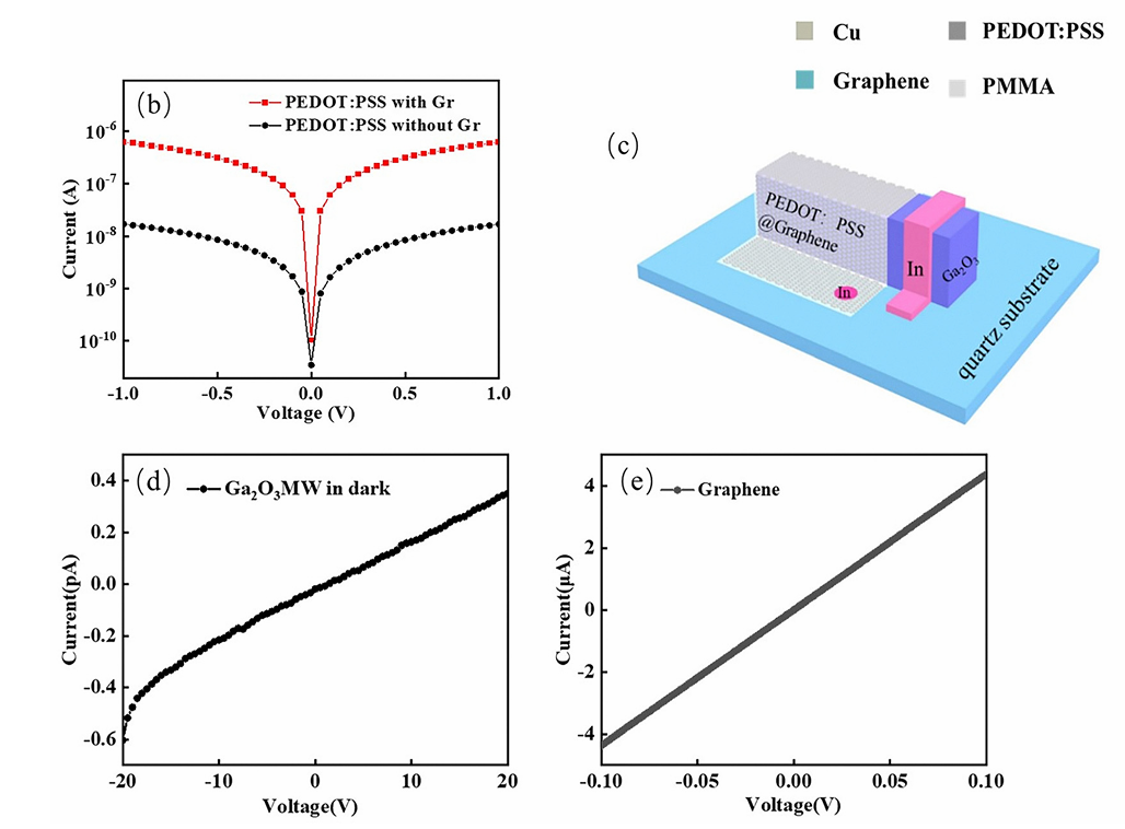 图2 (a) PEDOT:PSS@Gr 复合结构的制备工艺示意图;(b) 含石墨烯与不含石墨烯的 PEDOT:PSS 薄膜 I–V 特性;(c) PEDOT:PSS@Gr/β-Ga₂O₃ 微米线异质结器件示意图;(d) 和 (e) 分别为 β-Ga₂O₃ 微米线和石墨烯与电极接触的 I–V 特性曲线。