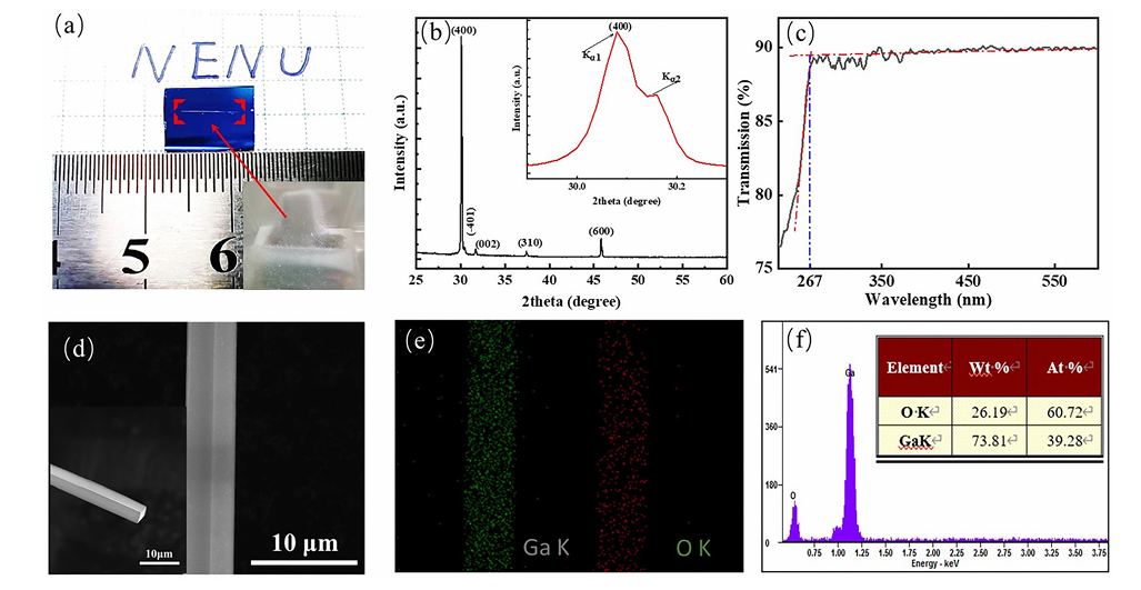 图1 (a) 单根 β-Ga₂O₃ 微米线在 SiO₂/Si 衬底上的光学图像,插图显示了放置在刚玉舟中的 β-Ga₂O₃ 照片;(b) β-Ga₂O₃ 的 XRD 图谱,插图显示 (400) 峰的放大视图;(c) β-Ga₂O₃ 微米线的透射光谱;(d) β-Ga₂O₃ 微米线的 SEM 图像,插图显示 β-Ga₂O₃ 微米线的横截面;(e) 单根 β-Ga₂O₃ 微米线中 Ga 和 O 元素的分布映射;(f) 单根 β-Ga₂O₃ 微米线的能谱(EDAX)分析