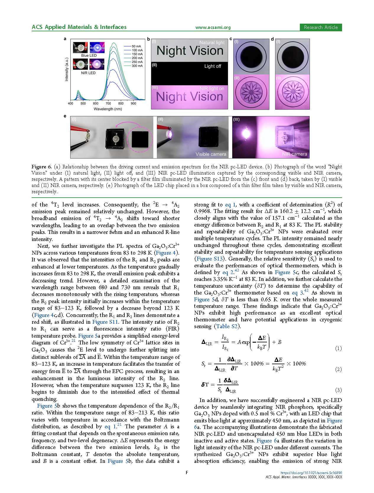 研究团队成功利用火焰喷雾热解(FSP)法合成了掺铬(Cr3+)的氧化镓(Ga2O3:Cr3+)纳米颗粒,并通过高温退火显著增强了其近红外(NIR)性能。通过对退火前后的透射电子显微镜(TEM)、X 射线衍射(XRD)和光致发光激发(PLE)结果进行对比分析,系统探讨了性能提升的机理。随后,研究对低温下 Ga2O3:Cr3+ 纳米颗粒的光学性能进行了表征,结果显示在低温下 2E → 4A2 跃迁的 R 线发射强度显著增强。源自能级分裂的 R1 和 R2 发射线表现出明显的温度依赖性,并遵循玻尔兹曼分布规律。这一特性使其能够基于荧光强度比(FIR)实现温度感测,在 83 K 时获得高相对灵敏度(Sr)3.35% K-1,显示出 Ga2O3:Cr3+ 纳米颗粒在低温下的优异感测能力。此外,这些 Ga2O3:Cr3+ 纳米颗粒被集成到商业 450 nm LED 中制备成近红外荧光转换 LED(NIR pc-LED),表现出高性能的近红外发光效果,并在夜视照明和防伪应用中展现出出色性能。