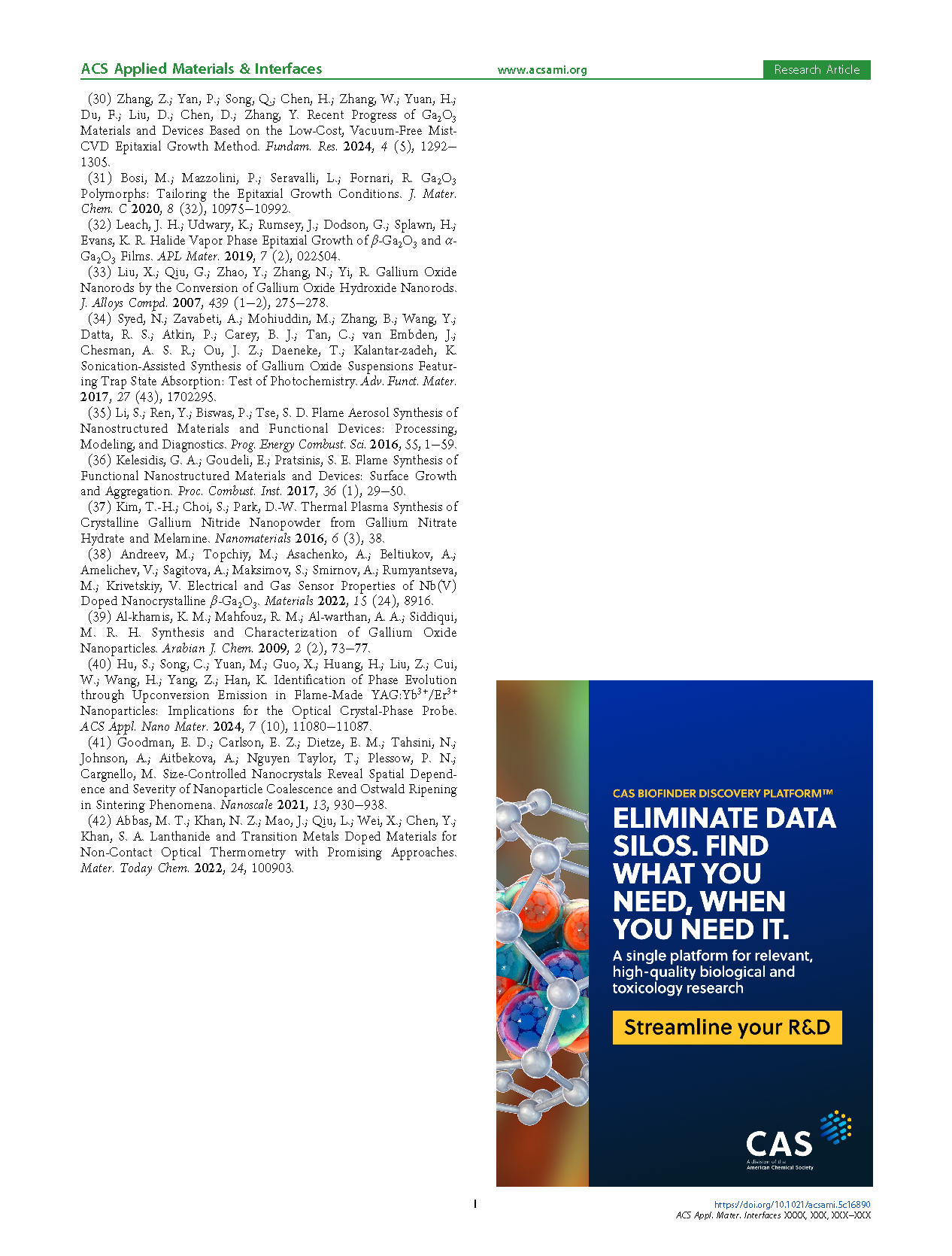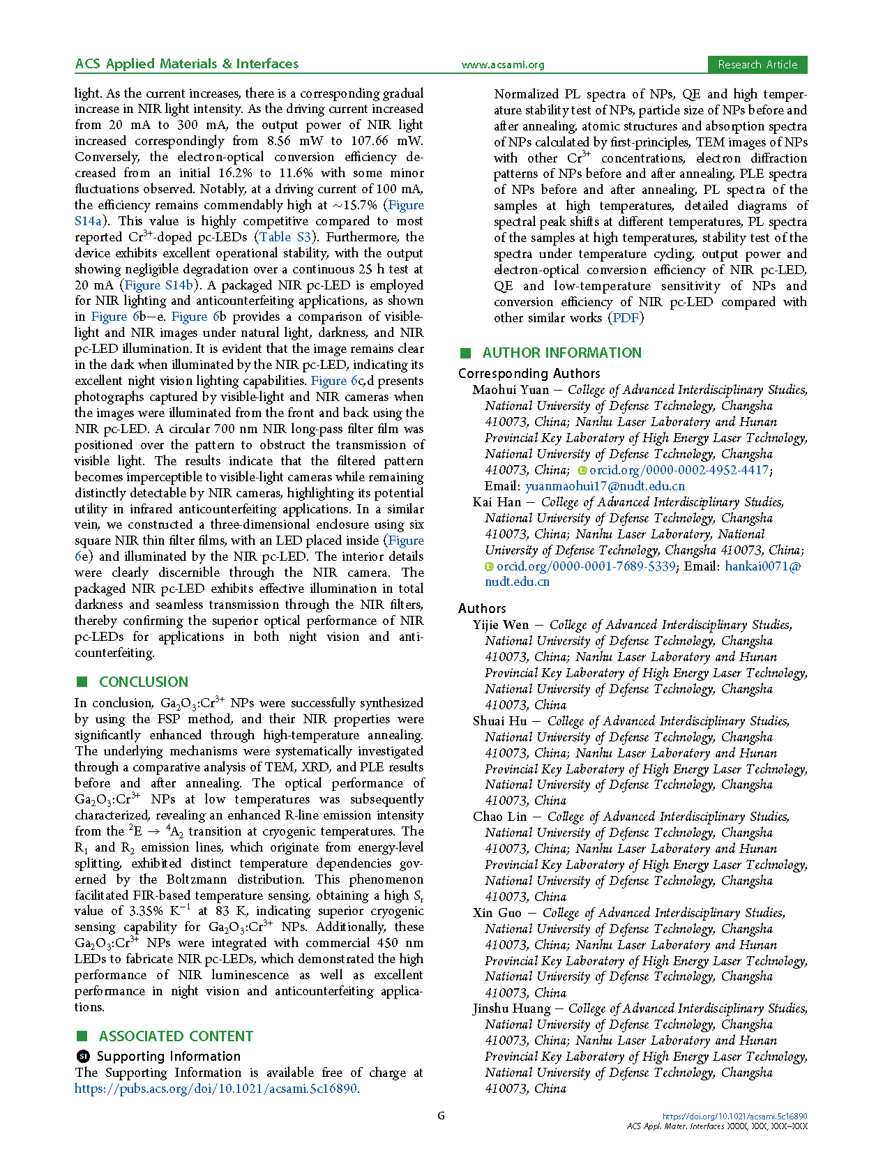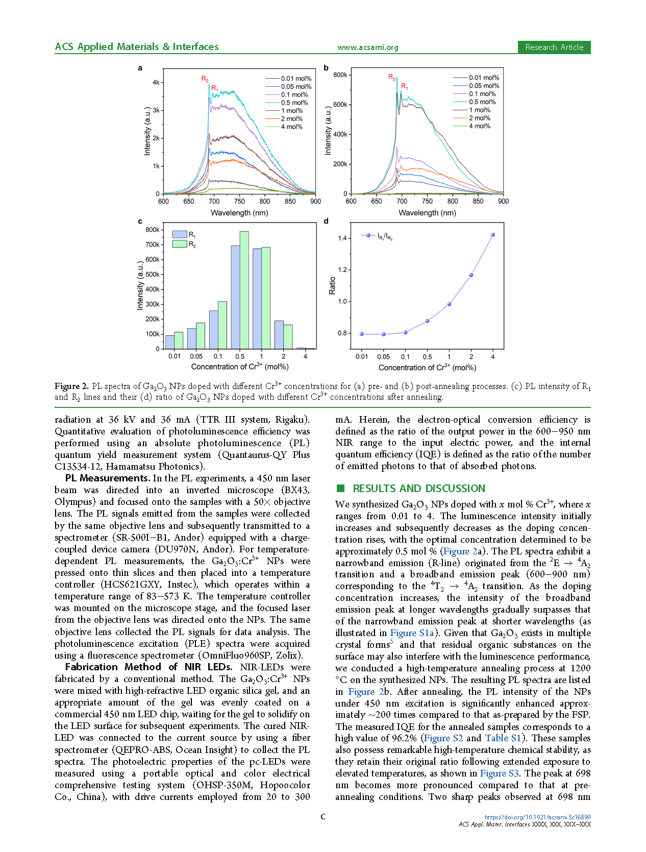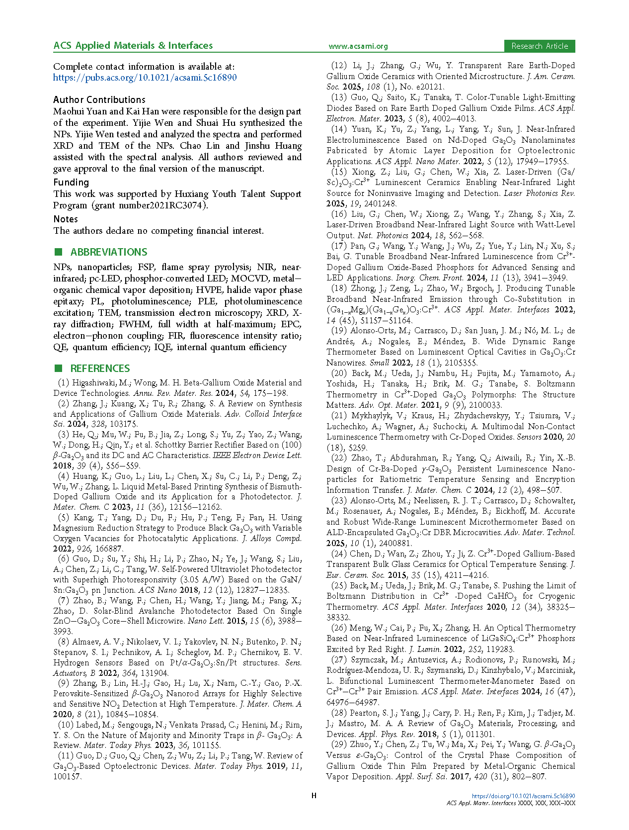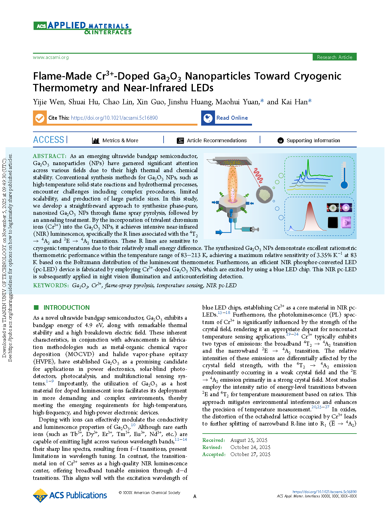 由中国人民解放军国防科技大学的研究团队在学术期刊 ACS Applied Materials & Interfaces 发布了一篇名为 Flame-Made Cr3+-Doped Ga2O3 Nanoparticles Toward Cryogenic Thermometry and Near-Infrared LEDs(火焰法制备 Cr3+ 掺杂 Ga2O3 纳米颗粒用于低温温度测量与近红外 LED)的文章。
