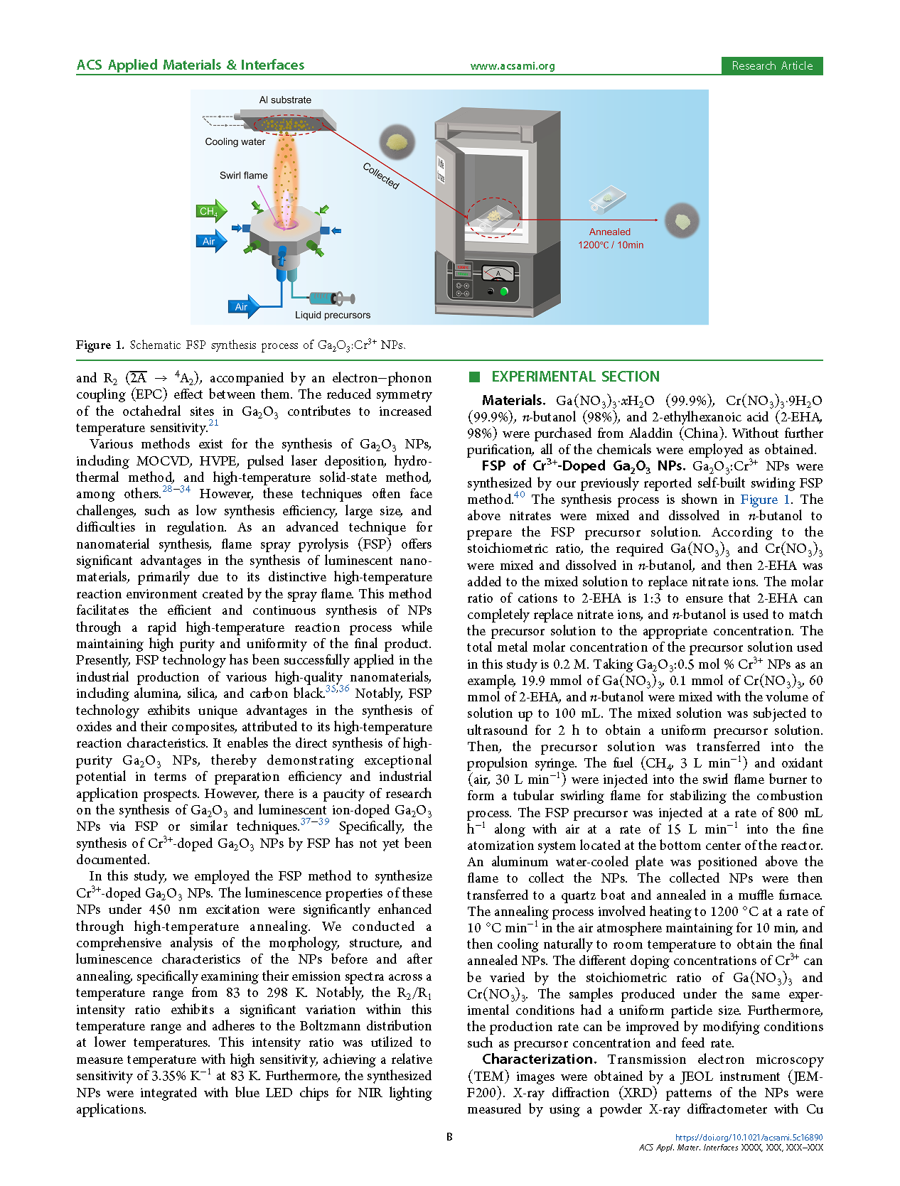氧化镓(Ga2O3)作为新型超宽禁带半导体,具有高热稳定性和高击穿电场,适用于功率电子器件和日盲光电探测等领域。通过掺杂 Cr3+ 离子,可实现宽带近红外发光并用于高灵敏度温度测量,但现有纳米颗粒制备方法存在效率低、粒径大和难以调控等问题。火焰喷雾热解法(FSP)提供了高温快速合成高纯均匀纳米颗粒的优势,但 Cr3+ 掺杂 Ga2O3 NPs 尚未报道。本研究利用 FSP 制备 Cr3+ 掺杂 Ga2O3 NPs,并通过高温退火显著增强其发光性能,实现温度传感及近红外照明应用。