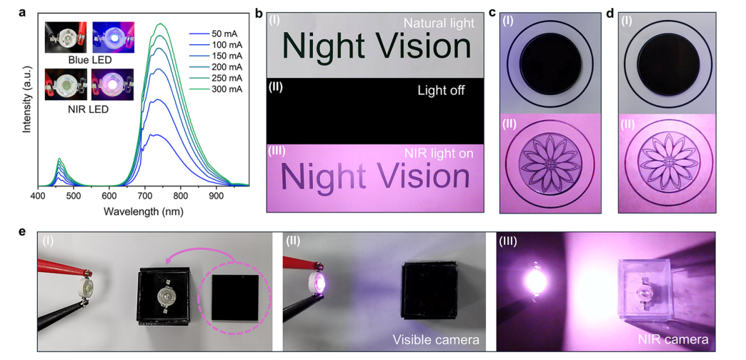 图 6. (a) NIR pc-LED 器件驱动电流与发射光谱的关系;(b) 在 (I) 自然光、(II) 熄灯、(III) NIR pc-LED 照明下拍摄的 “Night Vision” 字样照片,分别由可见光和 NIR 摄像机拍摄;(c) NIR pc-LED 从正面照射,滤光片遮挡的图案,由 (I) 可见光和 (II) NIR 摄像机拍摄;(d) 同样图案从背面照射,由 (I) 可见光和 (II) NIR 摄像机拍摄;(e) 分别由可见光和近红外相机拍摄的放置在由薄滤光膜组成的盒子里的LED芯片的照片。