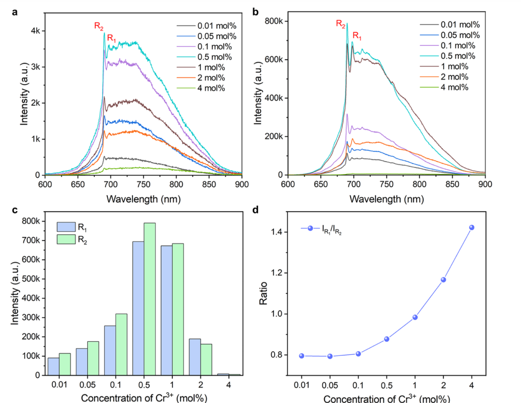 图 2. 不同 Cr3+ 掺杂浓度的 Ga2O3 纳米颗粒的光致发光(PL)光谱:(a) 退火前;(b) 退火后;(c) 退火后 R1 和 R2 发光强度;(d) 退火后 R2/R1 强度比。