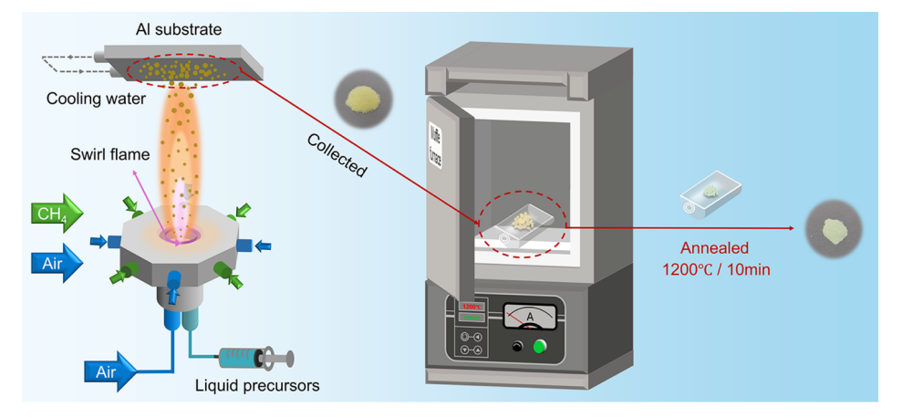 图 1. Ga2O3:Cr3+ 纳米颗粒的火焰喷雾热解(FSP)合成过程示意图。