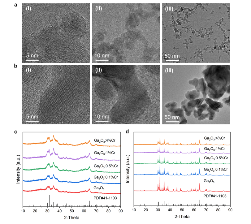 图 3. Ga2O3:0.5 mol% Cr3+ 纳米颗粒的透射电子显微镜(TEM)图像:(a) 退火前;(b) 退火后。不同 Cr3+ 掺杂浓度的 Ga2O3 纳米颗粒 X 射线衍射(XRD)图谱:(c) 退火前;(d) 退火后。