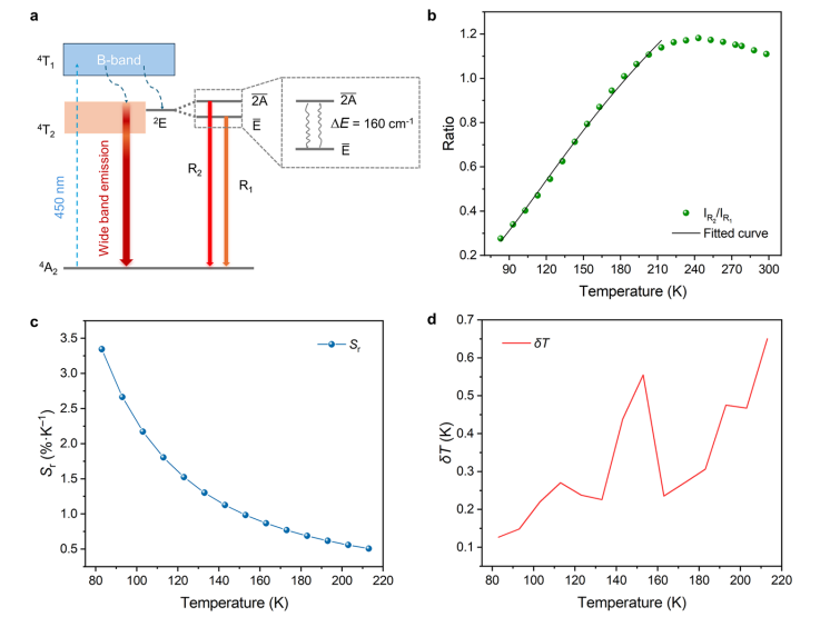 图 5. (a) Cr3+ 离子简化能级图;(b) Ga2O3:0.5 mol% Cr3+ 纳米颗粒 R2/R1 强度比及其随温度拟合结果;(c) 随温度变化的相对灵敏度 Sr;(d) 随温度变化的温度分辨率 δT。