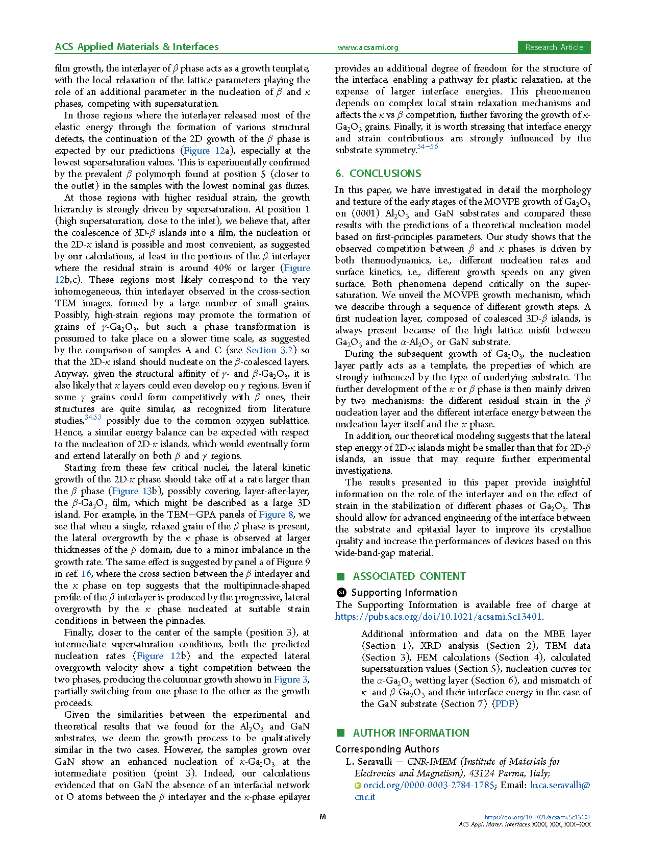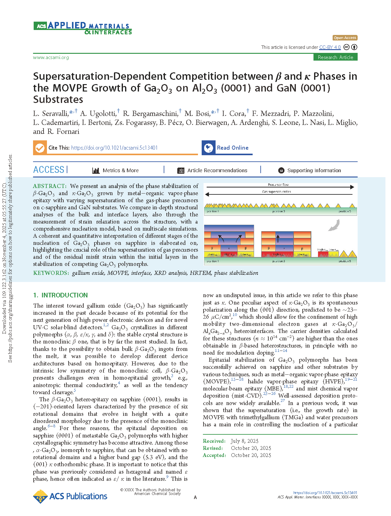 由意大利帕尔马大学Roberto Fornari教授领导的研究团队在学术期刊 ACS Applied Materials & Interfaces 发布了一篇名为 Supersaturation-Dependent Competition between β and κ Phases in the MOVPE Growth of Ga2O3 on Al2O3 (0001) and GaN (0001) Substrates(在 Ga2O3 在 Al2O3 (0001) 和 GaN (0001) 衬底上 MOVPE 生长过程中 β 相与 κ 相的过饱和度依赖竞争)的文章。