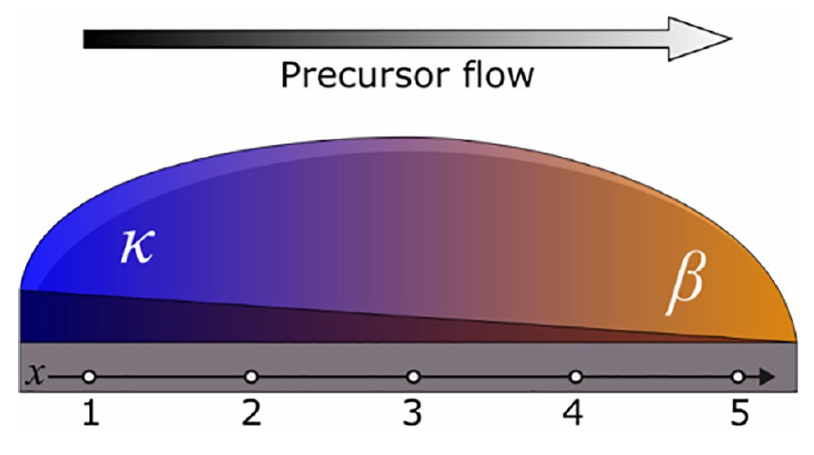 图1. 样品的三维示意图,展示了沿直径方向的不均匀生长条件——从进料区(点1)到出料/排气区(点5),导致厚度梯度以及Ga2O3相的变化。数字1–5表示沿直径均匀分布的表征位置。