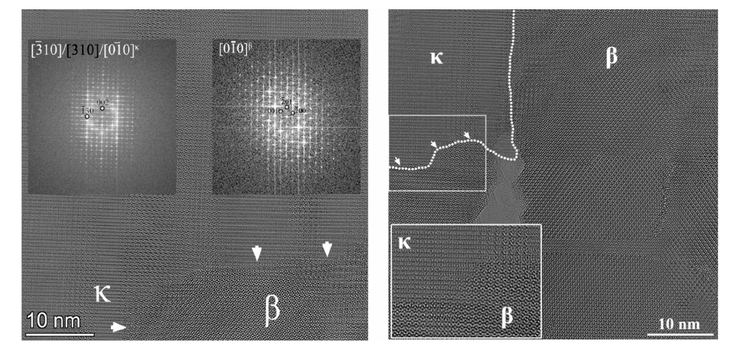 图4. 样品B(生长在GaN上)的高分辨透射电子显微镜(HRTEM)图像,箭头及放大图显示了κ区与β区的界面。带有标注的的FFT图展示了两晶体(κ与β)之间的取向关系。