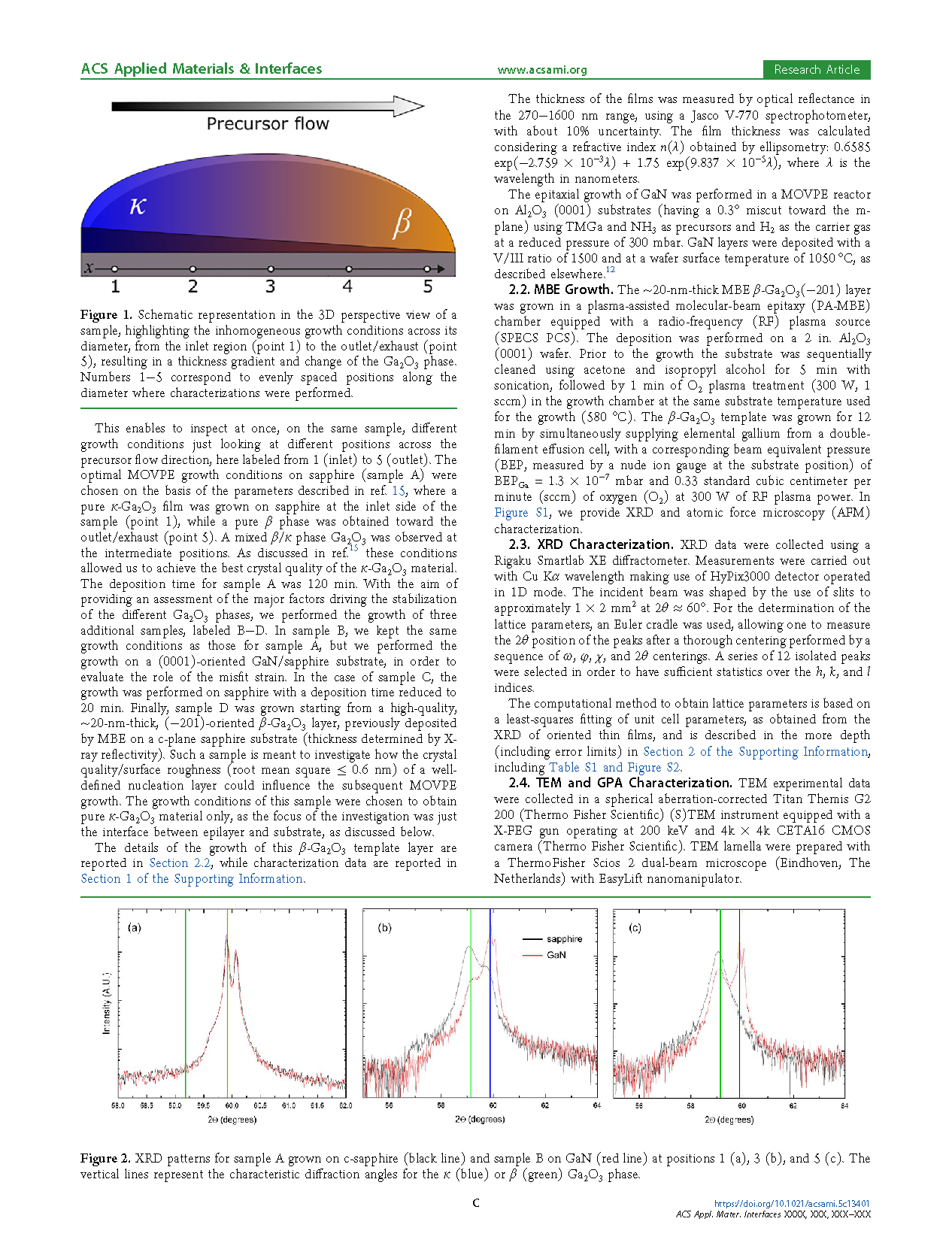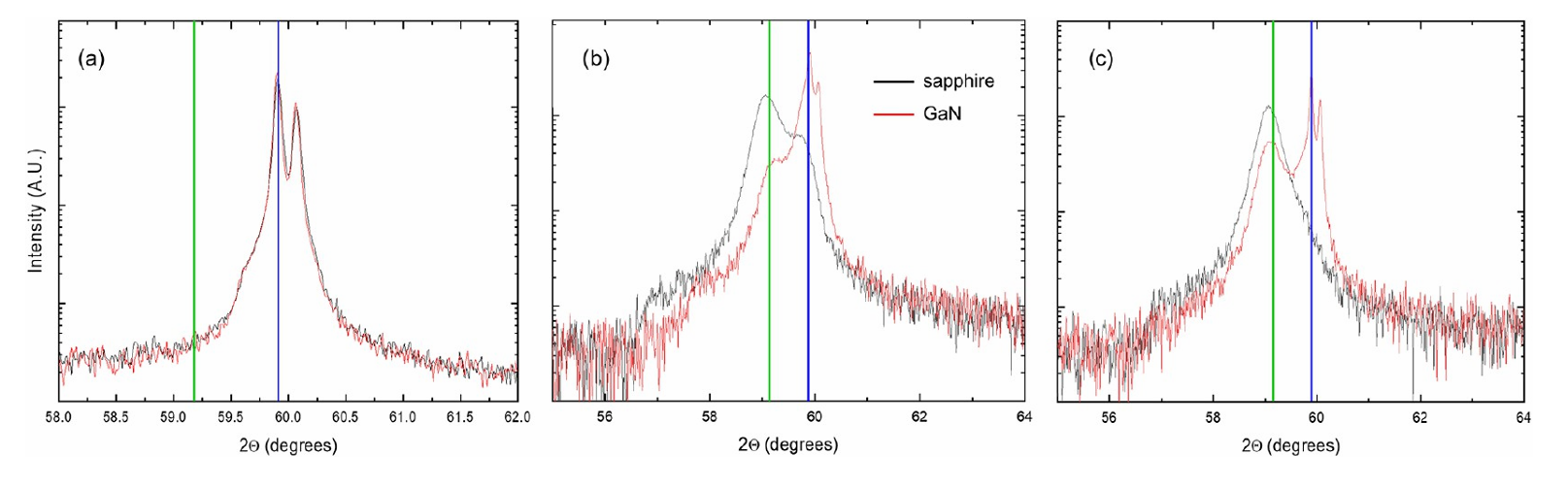 图2. 样品A(生长在c-蓝宝石上,黑线)和样品B(生长在GaN上,红线)在位置1(a)、3(b)和5(c)的XRD图谱。竖线表示κ(蓝色)或β(绿色)Ga2O3相的特征衍射角。