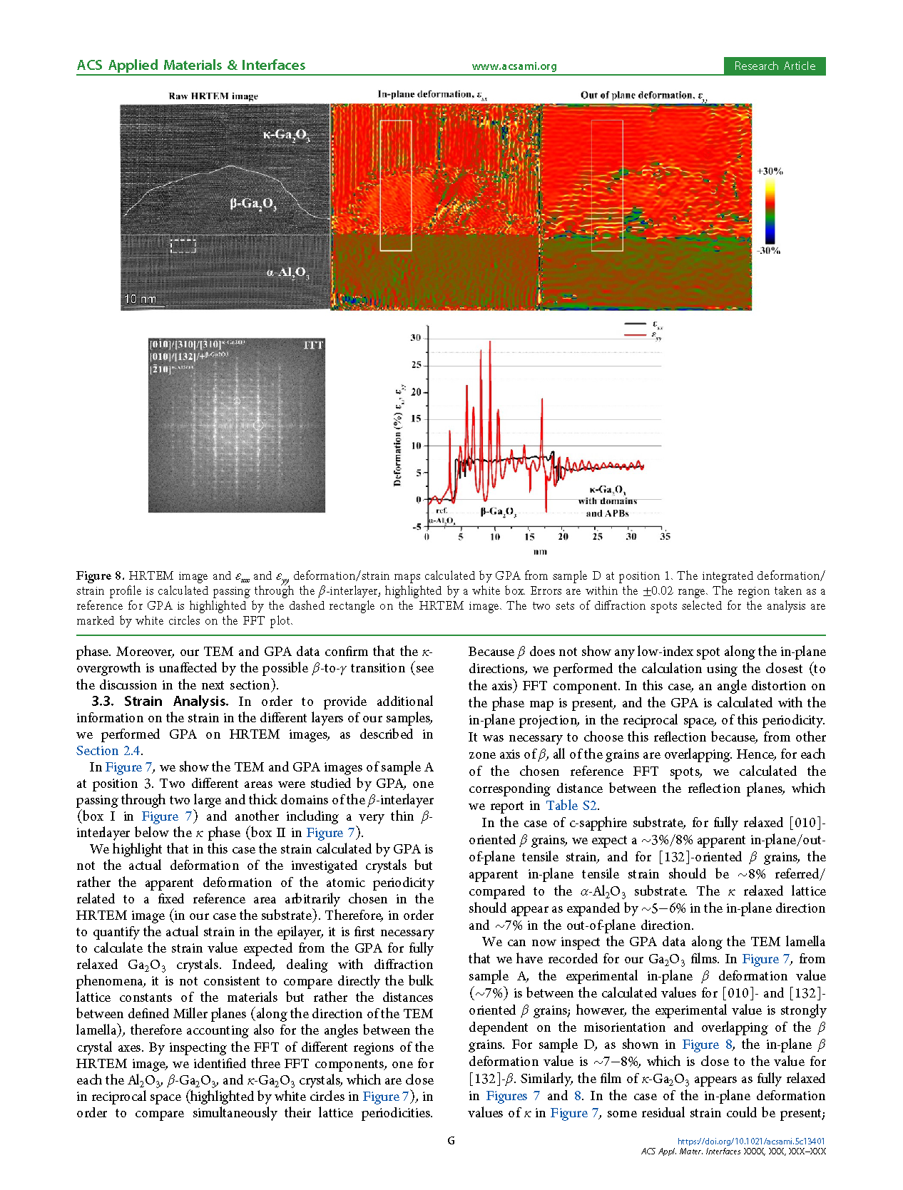 图9. 样品B在位置1的透射电子显微镜(TEM)及几何相位分析(GPA)图像。HRTEM图像及通过GPA计算的 εxx 和 εyy 形变/应变图。积分形变/应变曲线沿β-中间层计算,并以白色拉长方框标出。误差范围在±0.02以内。作为GPA参考的区域在HRTEM图像中以虚线矩形标出。用于分析的两组衍射点在FFT图中以白色圆圈标记。