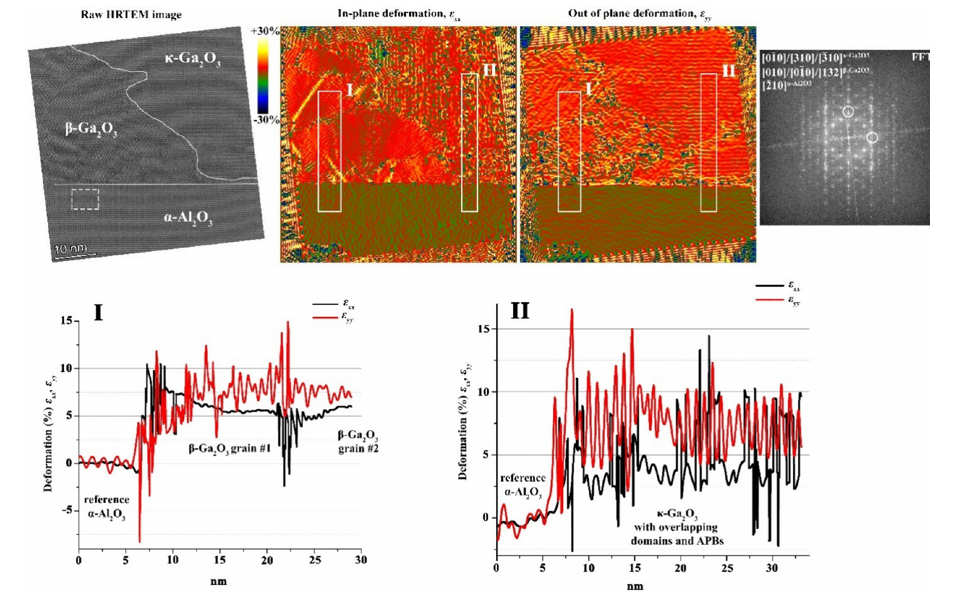 图7. 样品A在位置3的高分辨透射电子显微镜(HRTEM)图像及通过几何相位分析(GPA)计算得到的形变/应变图。下方面板显示的积分形变/应变曲线取自两个不同区域(标记为盒子I和II):左侧为穿过两个大而厚的β-中间层区域,右侧为κ相下方的非常薄的β-中间层区域。误差范围在±0.02以内。作为GPA参考的区域在HRTEM图像中以虚线矩形标出。在右上角FFT图中,用白色圆圈标记了用于分析的两组衍射点。