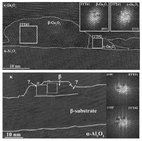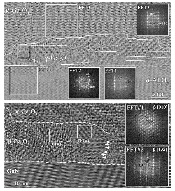图6. 样品C(蓝宝石上,顶部)和样品D(β-Ga2O3模板上,底部)界面的高分辨透射电子显微镜(HRTEM)图像,带有标注的FFT图显示所识别相的取向。
