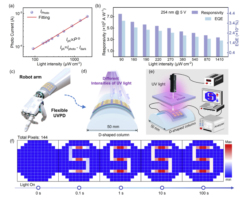 图 6. (a) 不同光强下光电流 (Ip) 的演变图;(b) 不同光强下的响应度 (R) 和外量子效率 (EQE);(c) 应用概念示意图;(d) D 型柱的截面结构及紫外光照射示意图;(e) 紫外成像系统;(f) 开启紫外光照射后图像对比度的演变。