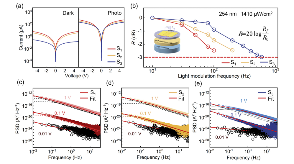 图 3. (a) 不同氧流条件下I–V 特性曲线;(b) 不同氧流条件下 a-Ga2O3 UVPD 的频率响应;(c–e) 不同偏压下的噪声功率谱密度 (PSD)。