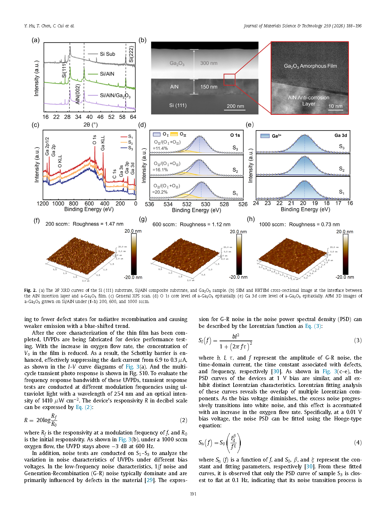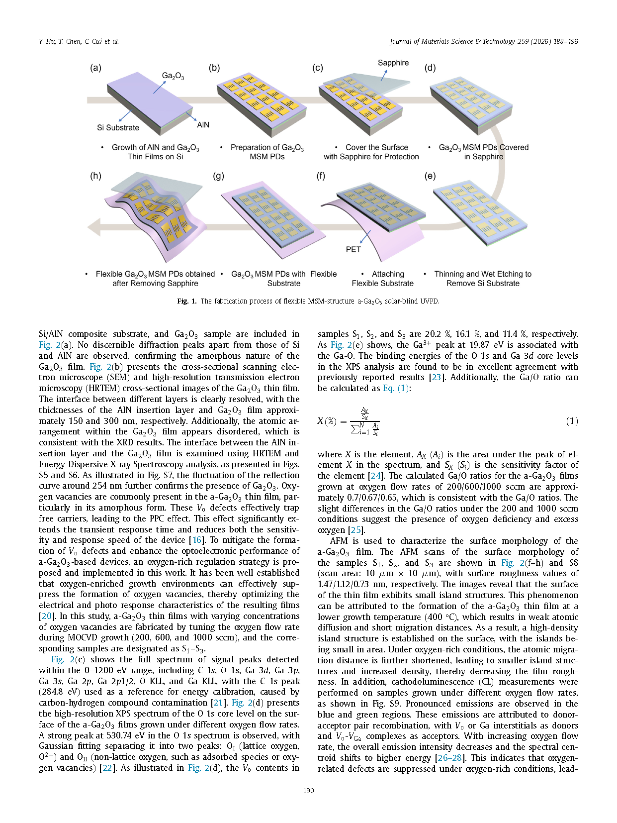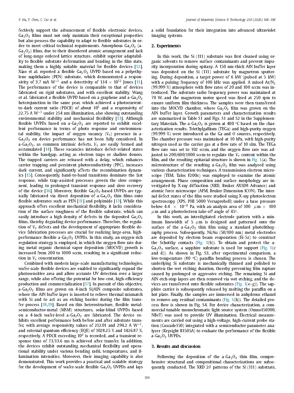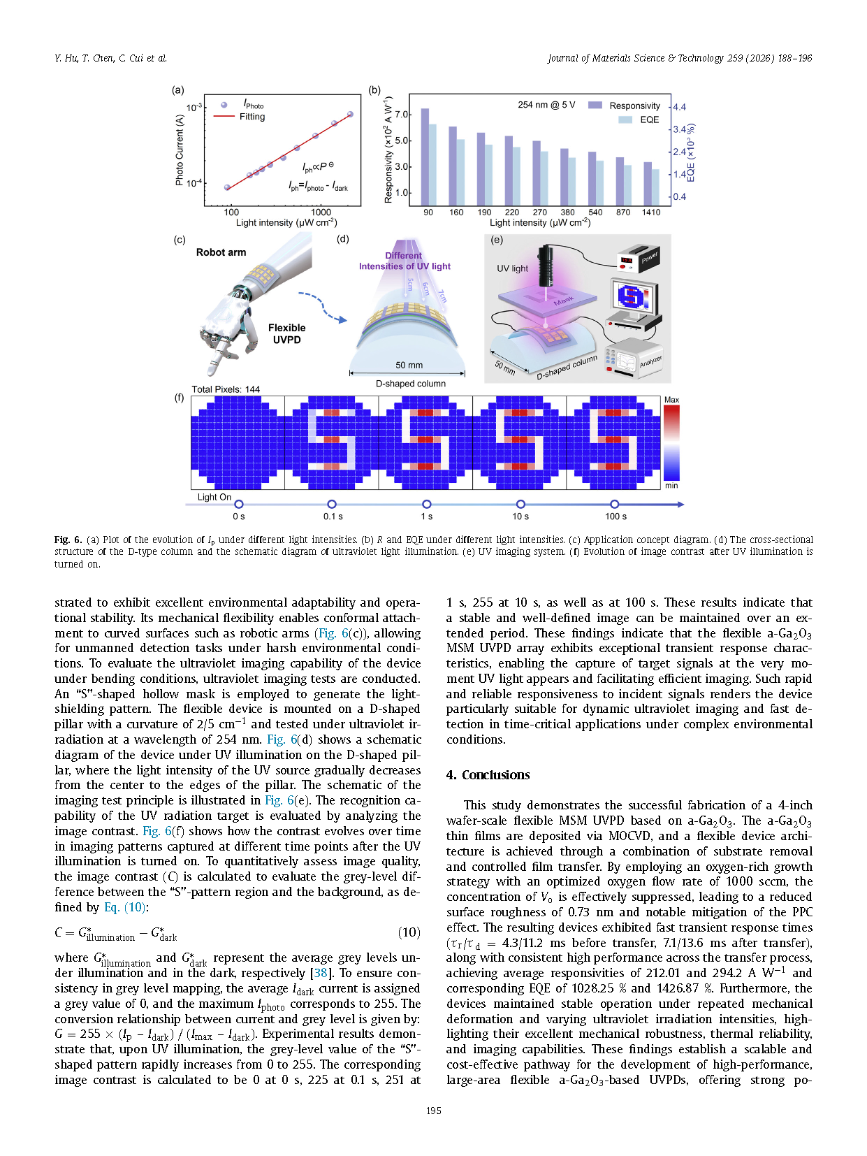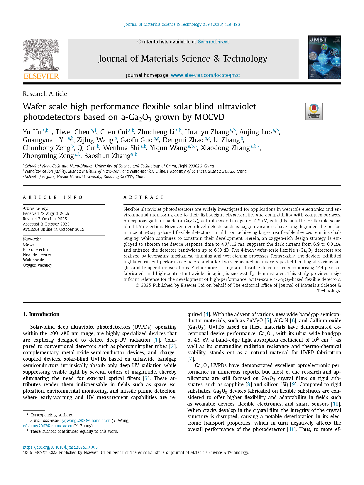 由中国科学院苏州纳米所纳米加工平台、中国科学技术大学、河南师范大学的研究团队在学术期刊 Journal of Materials Science & Technology 发布了一篇名为Wafer-scale high-performance flexible solar-blind ultraviolet photodetectors based on a-Ga2O3 grown by MOCVD(基于 MOCVD 外延生长的 a-Ga2O3 的晶圆级高性能柔性日盲紫外光探测器)的文章。中国科学院苏州纳米技术与纳米仿生研究所的胡毓、陈体威博士为共同第一作者,张晓东、王逸群为通讯作者。