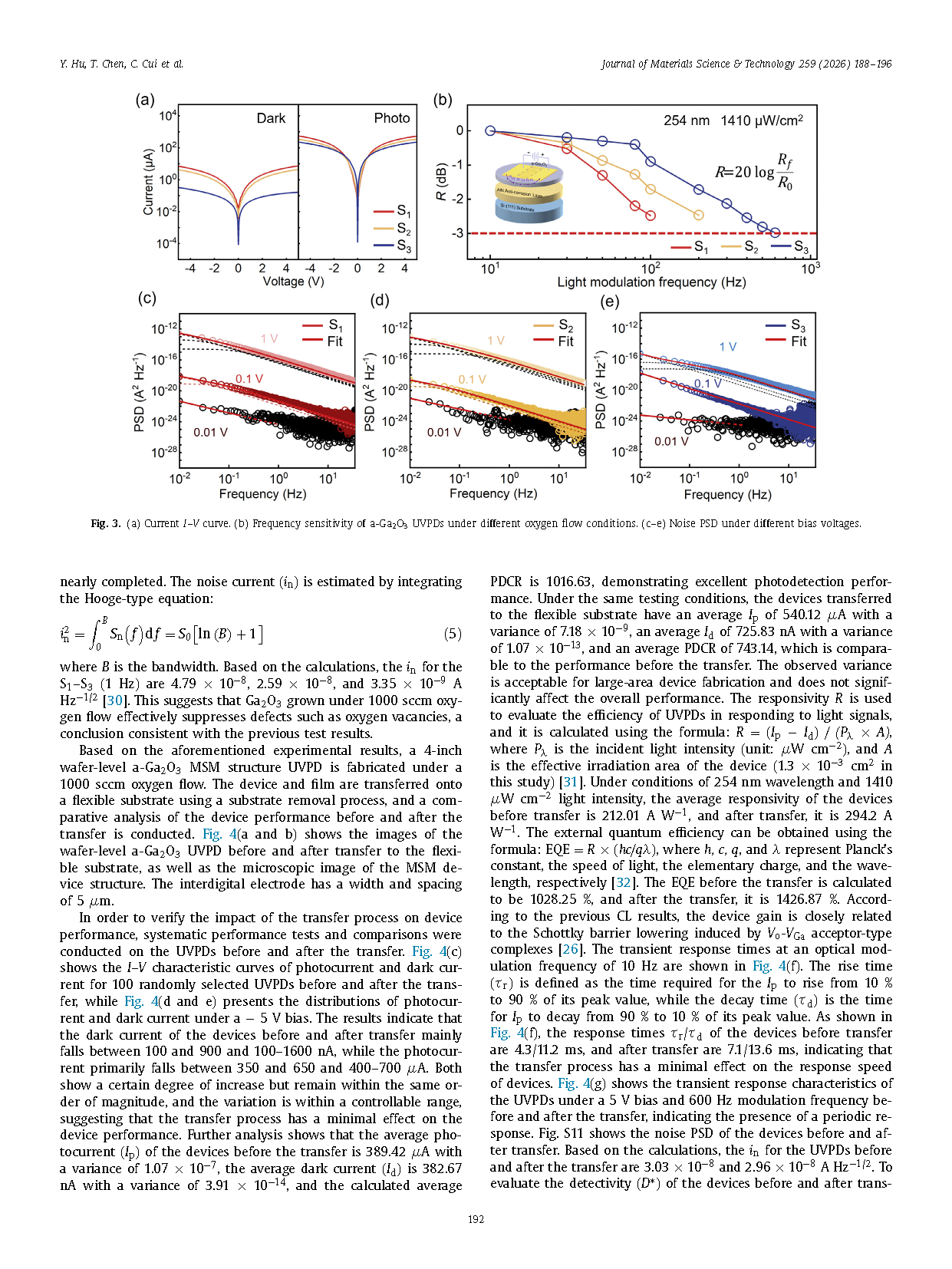 日盲深紫外光电探测器(UVPDs)在 200–280 nm 波段内工作,广泛应用于航天探测、环境监测和导弹尾迹探测等领域。传统基于刚性衬底的 Ga2O3 器件虽然性能优异,但在柔性电子、可穿戴设备等轻量、柔韧、可贴附的应用中会受到一定限制。非晶 Ga2O3(a-Ga2O3)薄膜具有无序的原子排列方式,因此对柔性衬底的变形和弯曲具有更好的适应性,使其成为制备柔性UVPD的理想材料。然而,由于 a-Ga2O3 中存在大量氧空位(Vo)等深能级缺陷易,会导致器件出现持续光电导(PPC)、暗电流增加及响应延迟,显著影响器件性能。因此,实现大面积、高性能柔性 a-Ga2O3 UVPD 需要同时优化材料缺陷(如降低 Vo 浓度)和器件工艺。该工作通过富氧设计策略提高 MOCVD 生长过程中的氧气流量,并结合 Si 衬底去除以及薄膜转移技术,实现 4 英寸晶圆级柔性金属-半导体-金属(MSM)UVPD,器件在转移前后均表现出高响应度、高外量子效率、快速瞬态响应,并在不同测试条件下展示出优异的机械柔性和环境稳定性,为柔性紫外探测器的大规模应用奠定了基础。