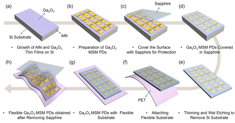 图 1. 柔性金属–半导体–金属(MSM)结构非晶氧化镓(a-Ga2O3)日盲深紫外探测器的制备流程。